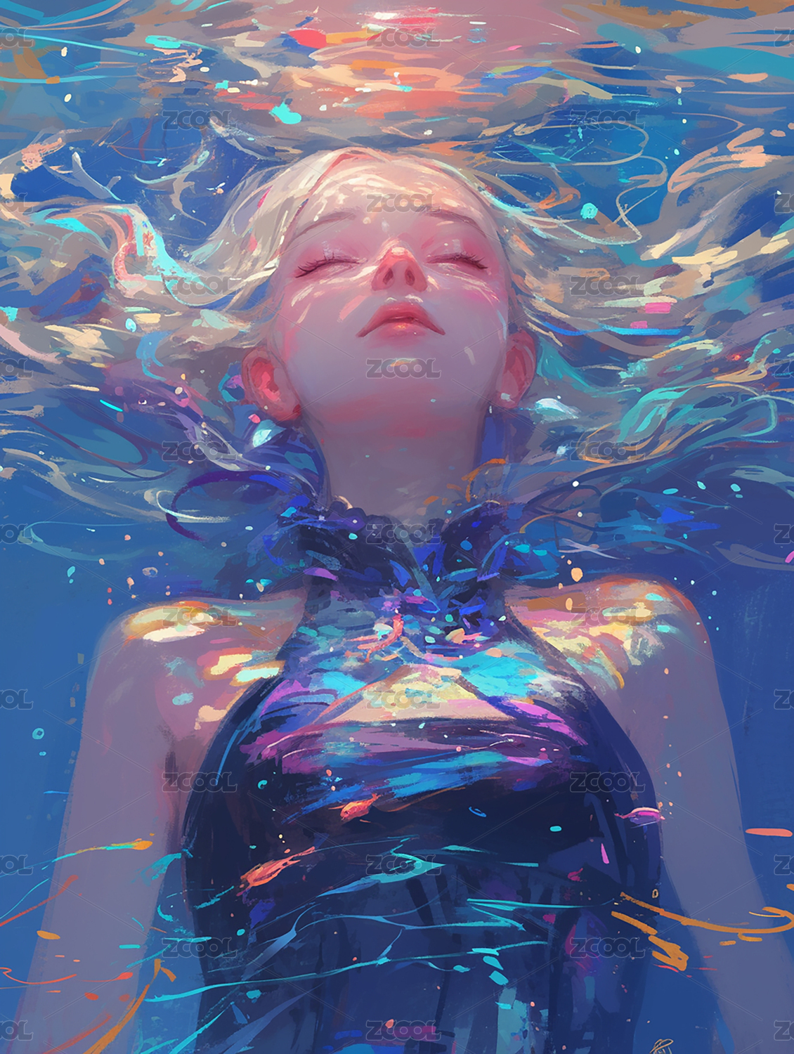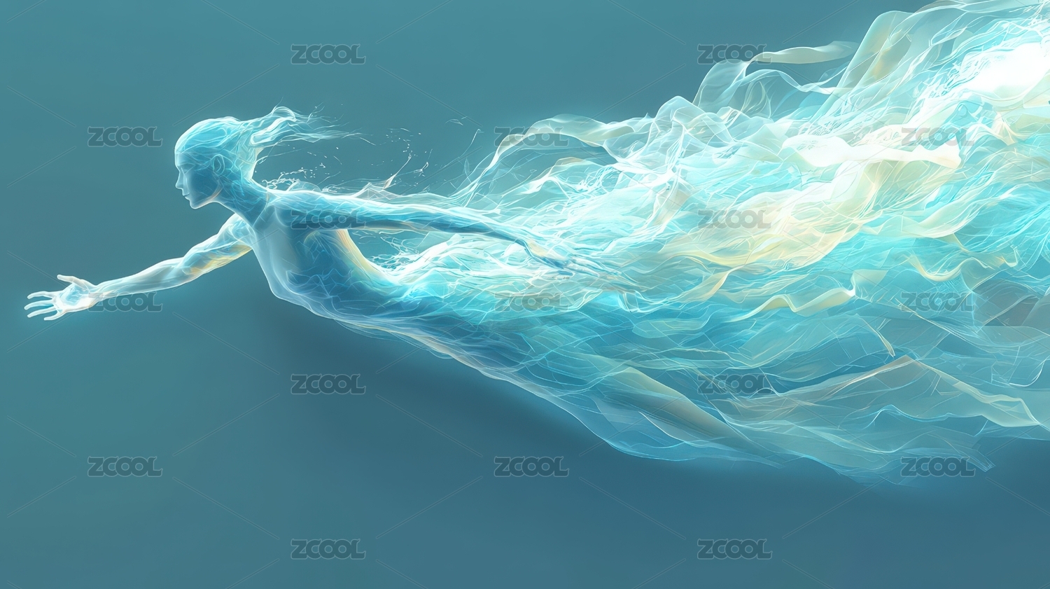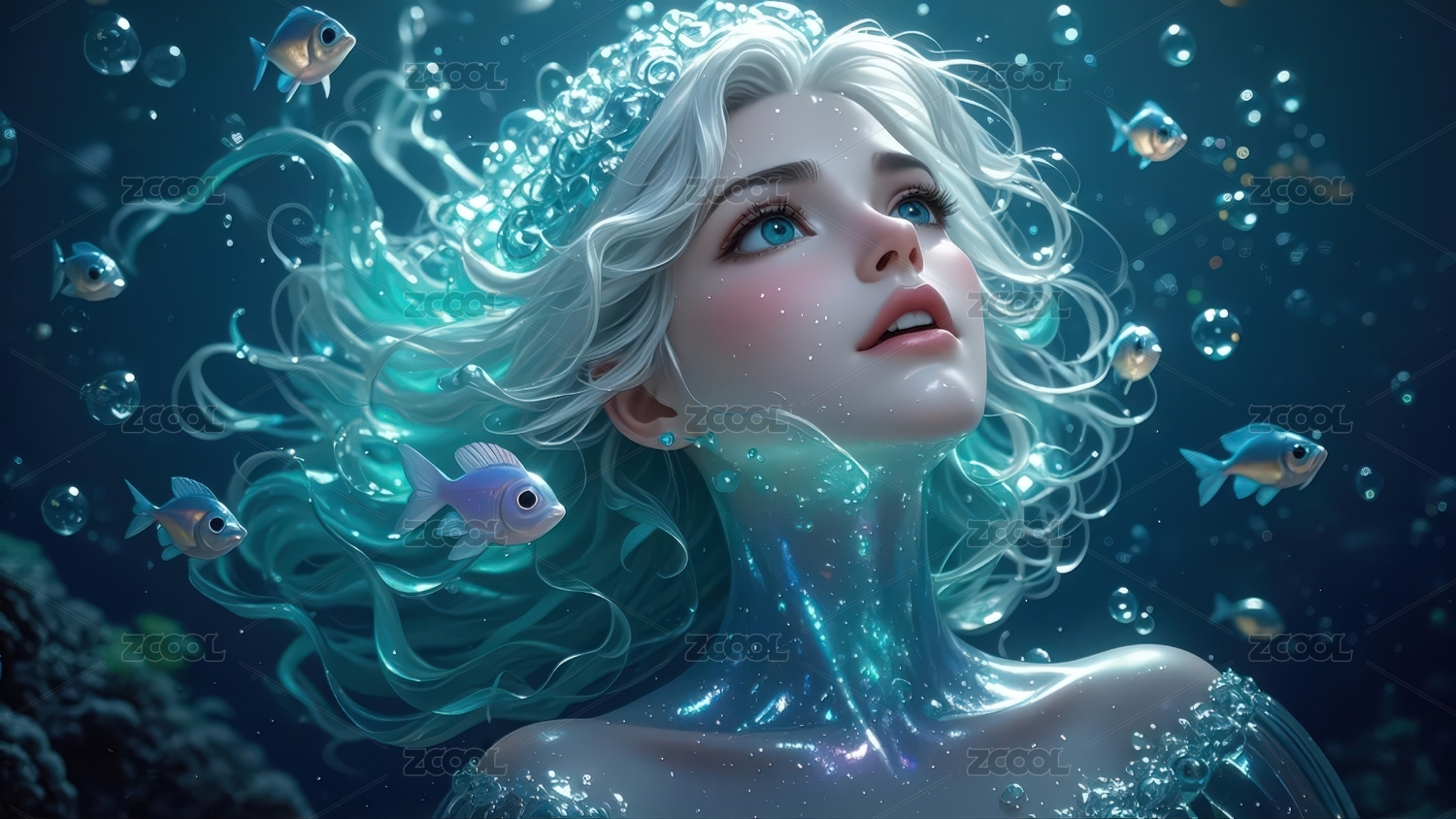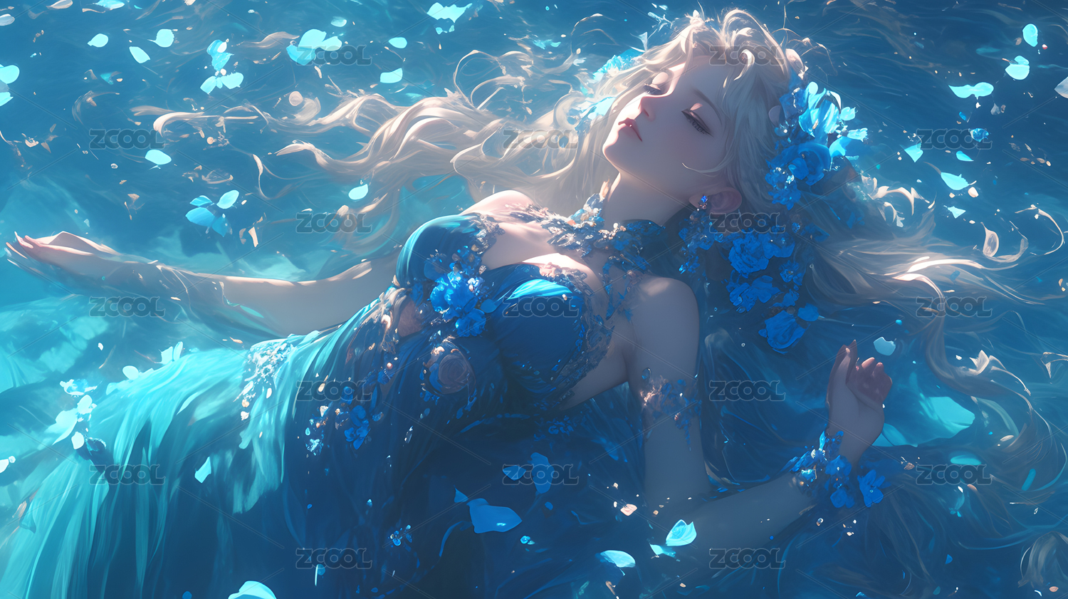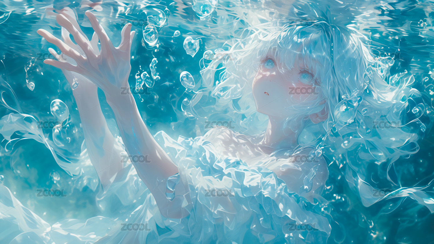 背景,自然,光影,梦幻,蓝色,水下,女子,双手,合十,气泡