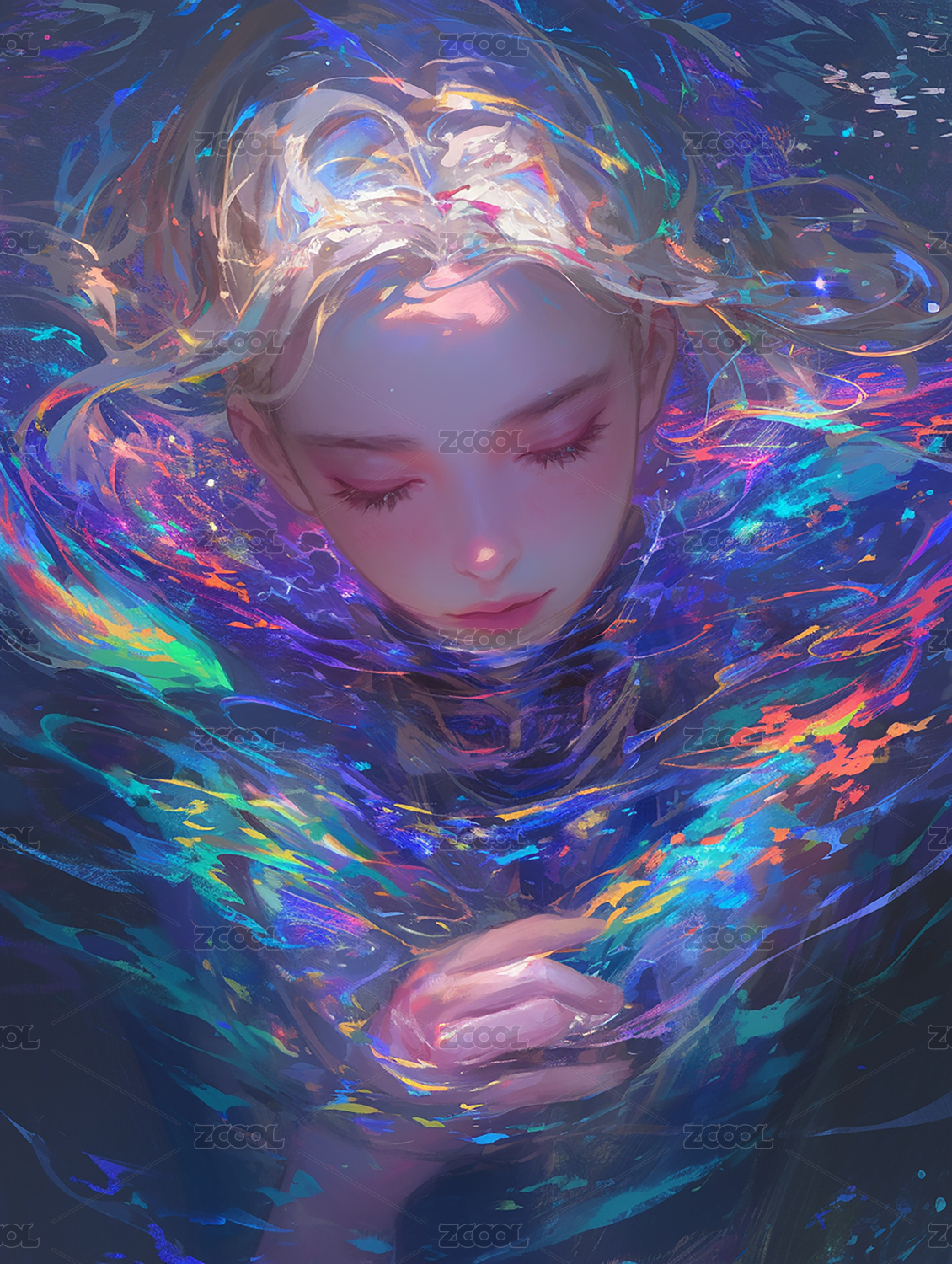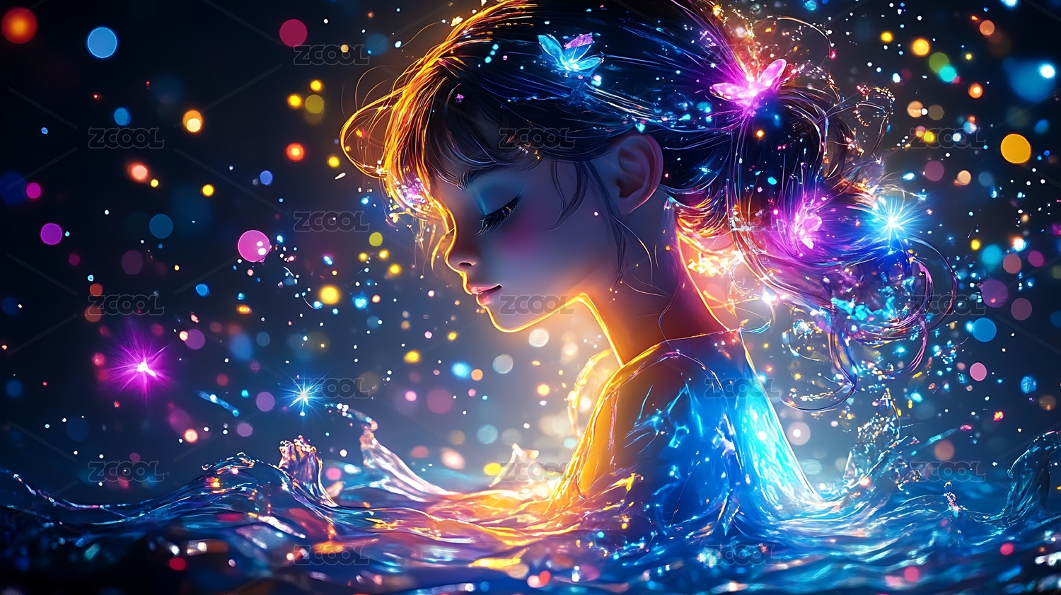 一个优雅的女生和色彩斑斓梦幻的夜晚