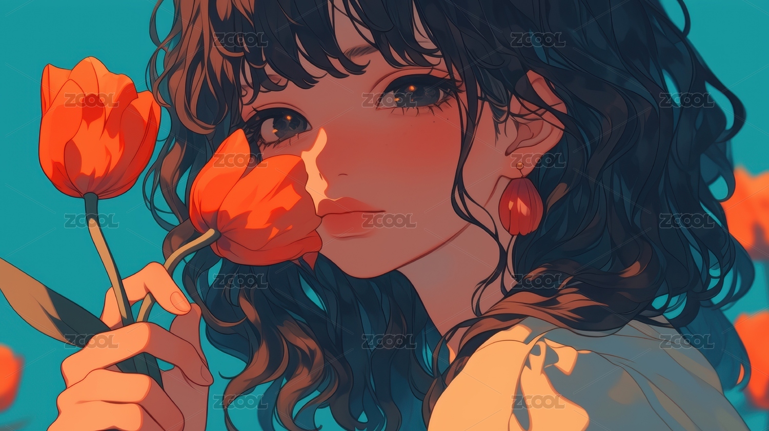 手持橙色花朵的卷发女孩