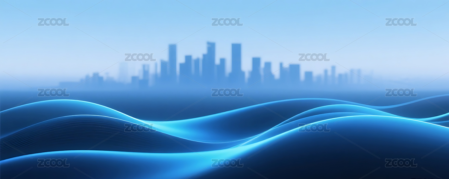 流畅的蓝色渐变波浪线条玻璃城市建筑
