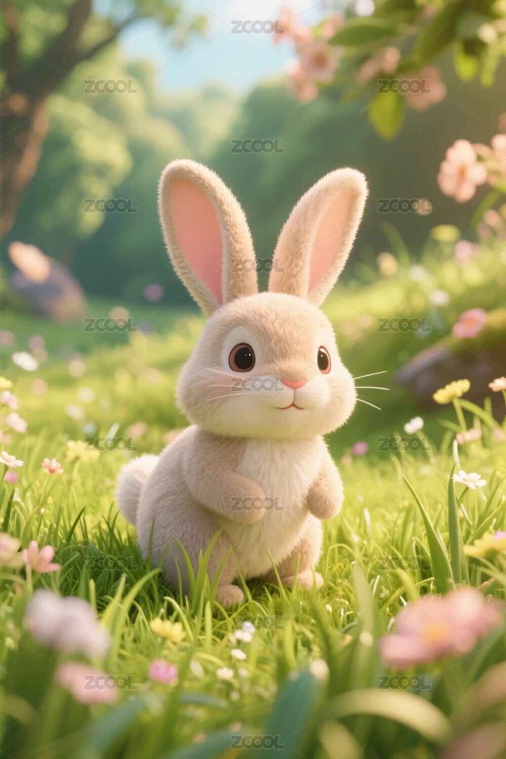 晴朗野外一只长耳朵红眼睛白兔3D卡通插画