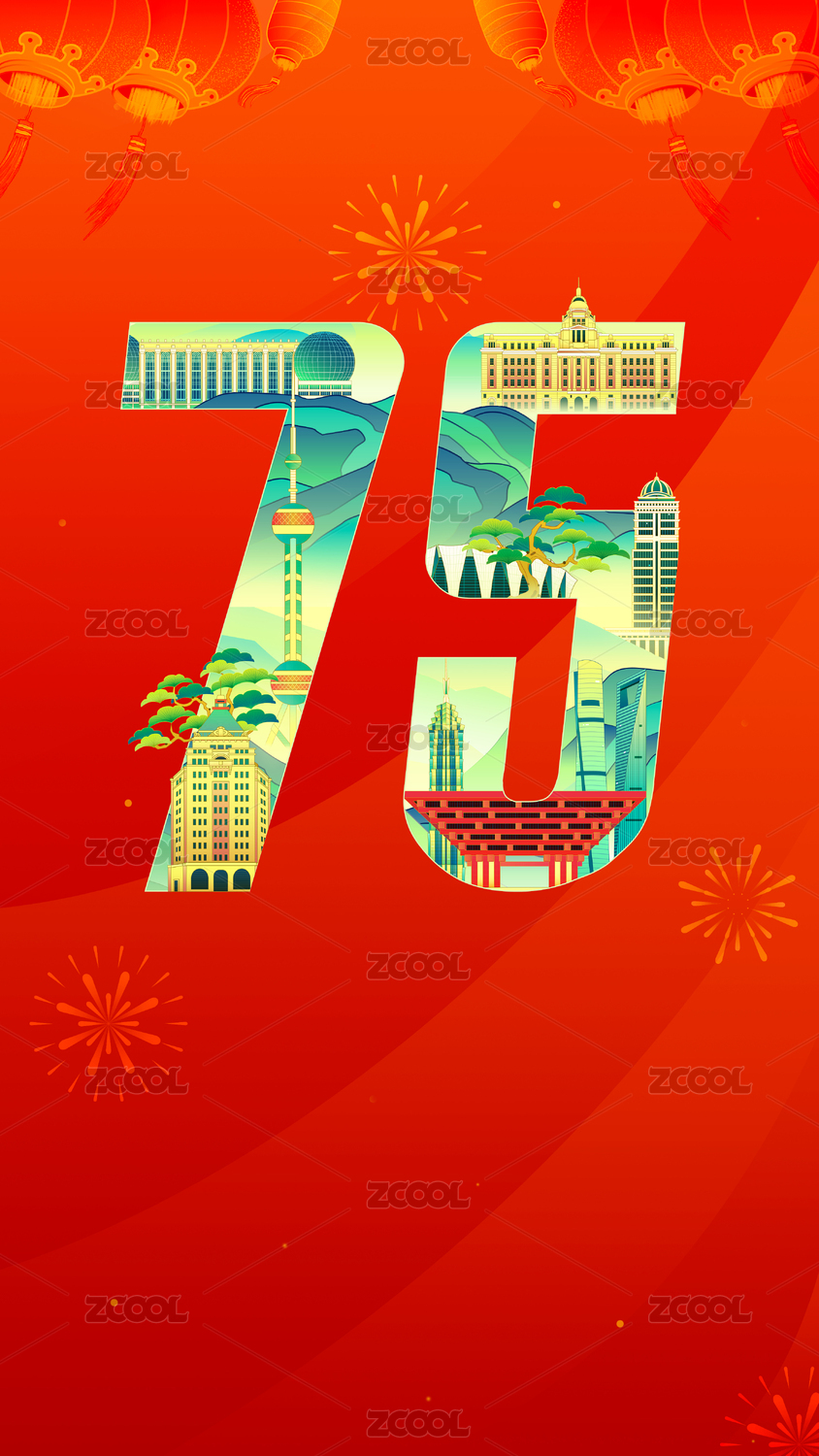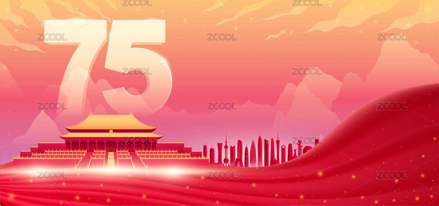 国庆节75周年国潮建筑插画