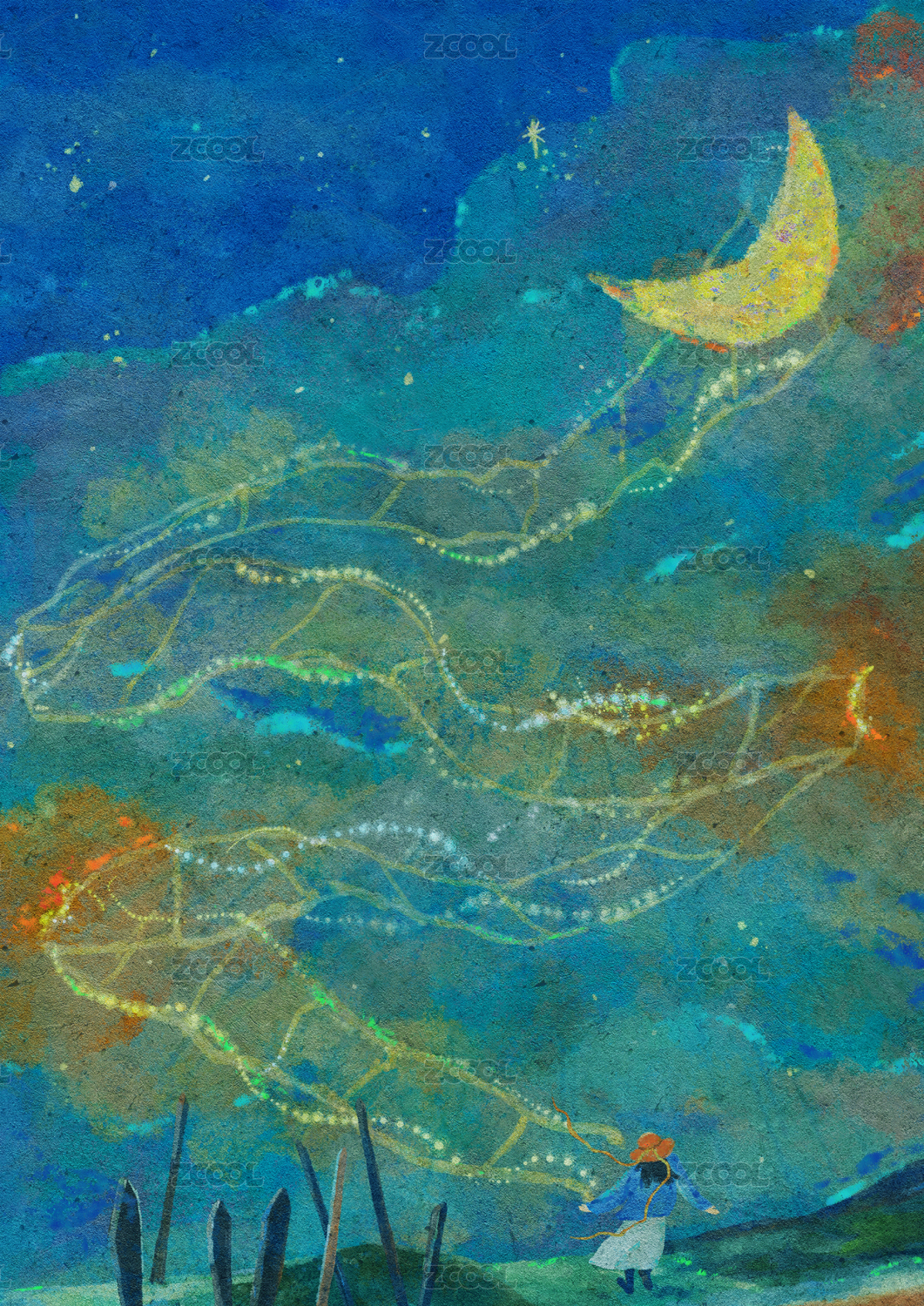 夜晚星空下女孩想通过星星天梯爬到月亮上去