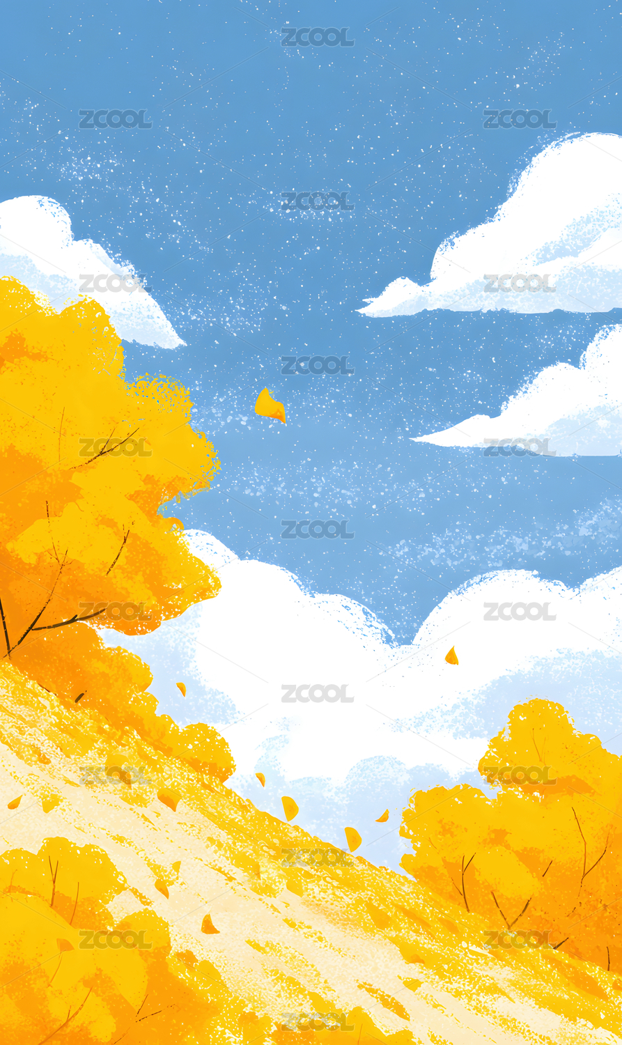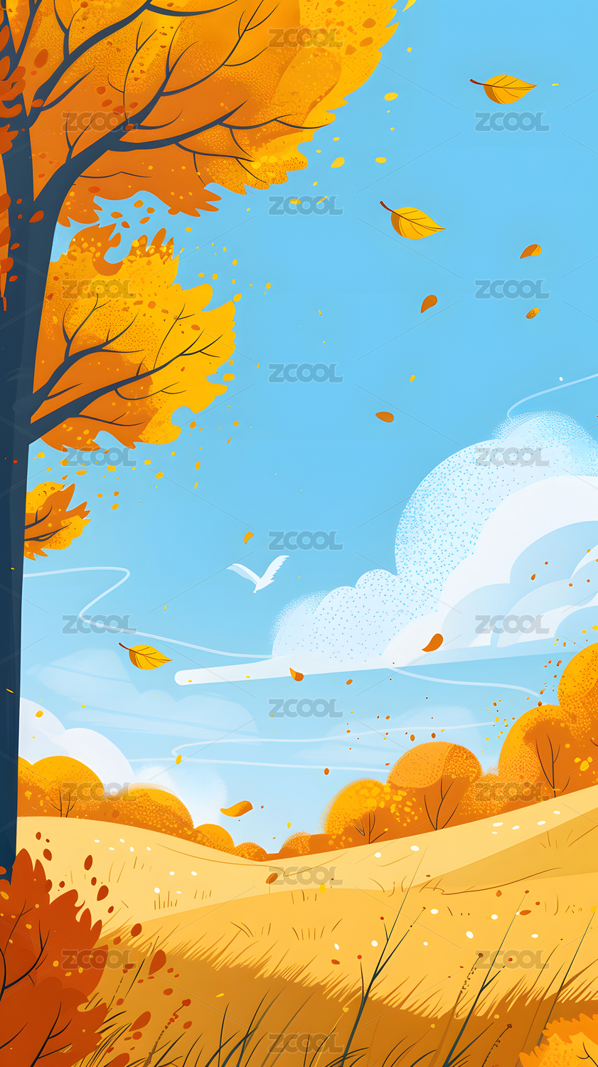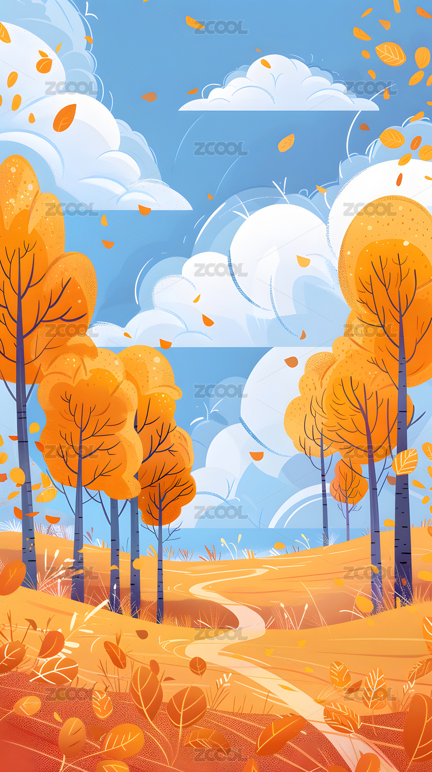 秋天扁平插画蓝天白云树木落叶壁纸竖版