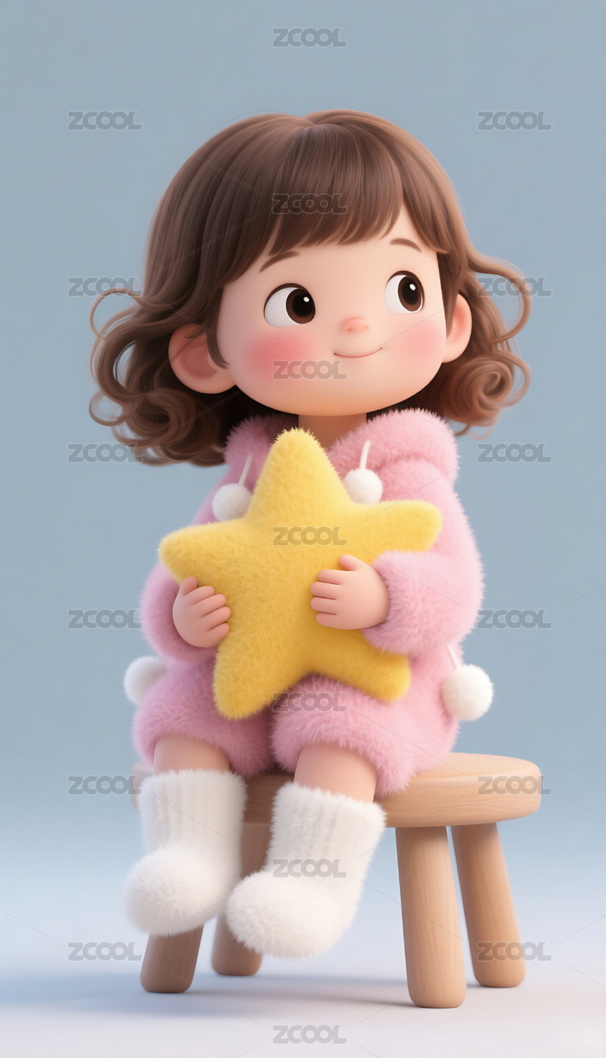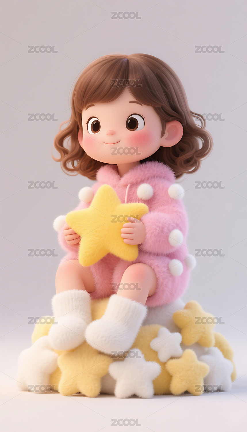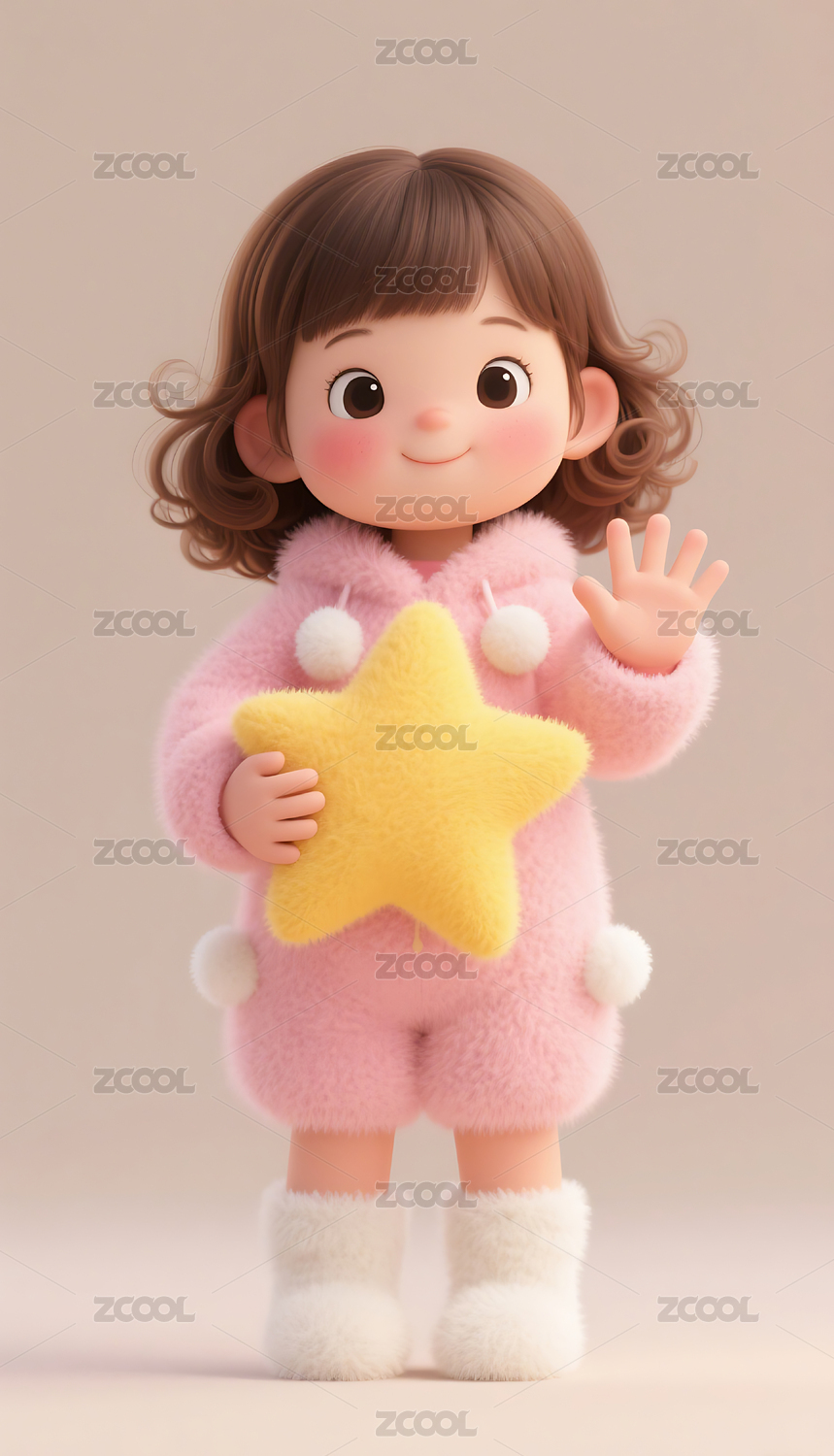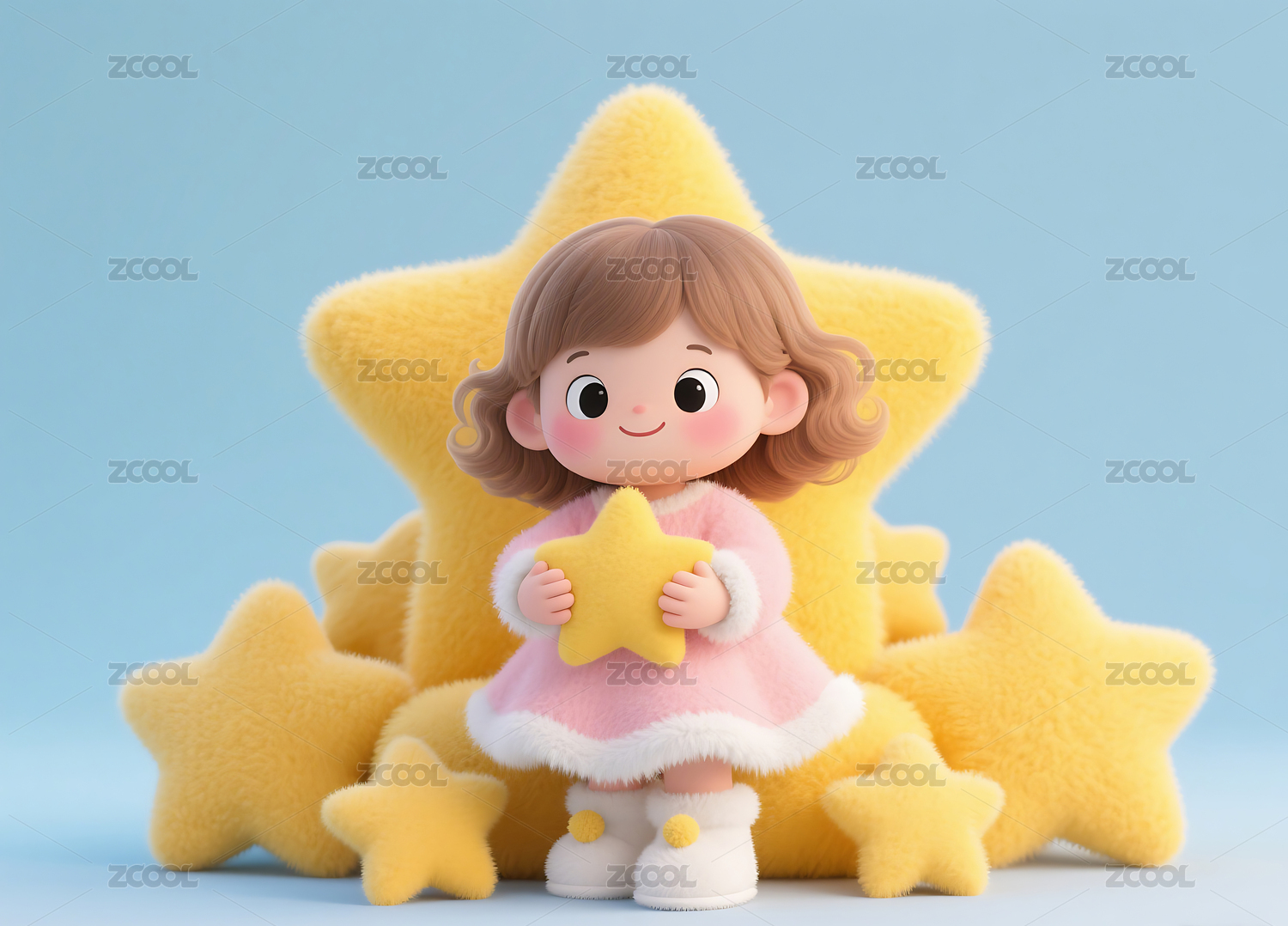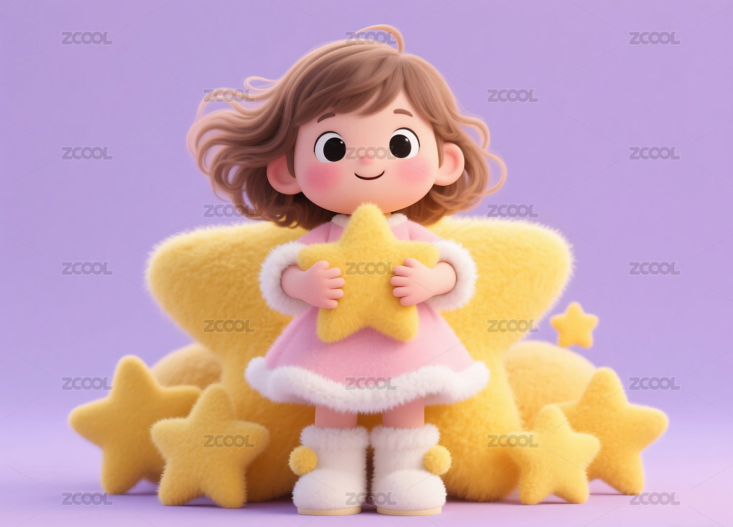 3D羊毛毡毛绒绒风格小女孩抱着星星模型