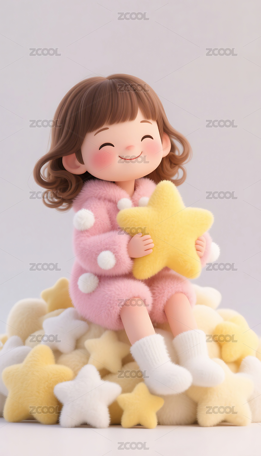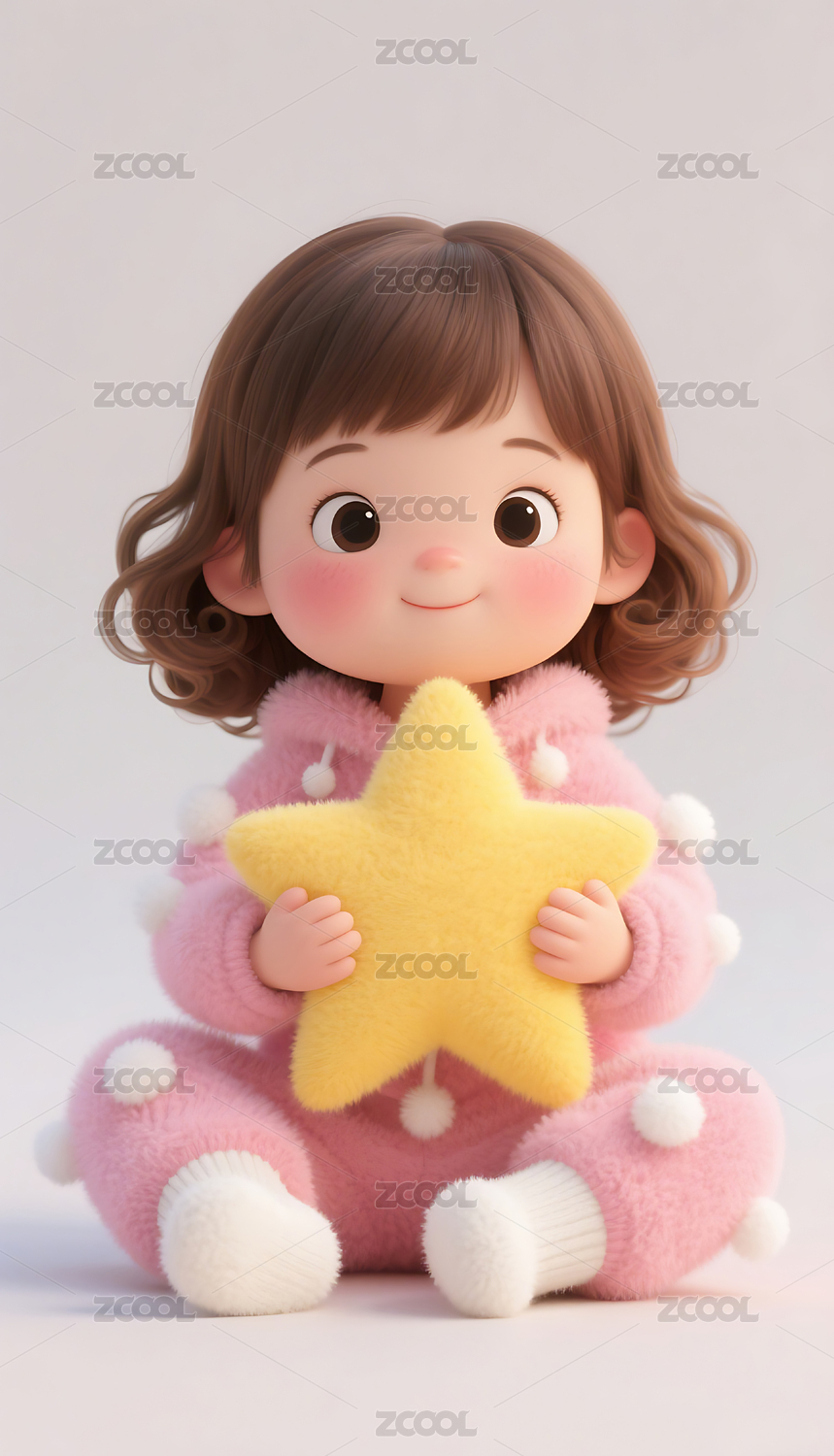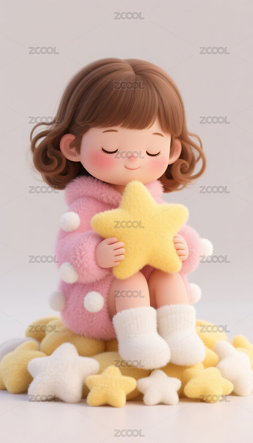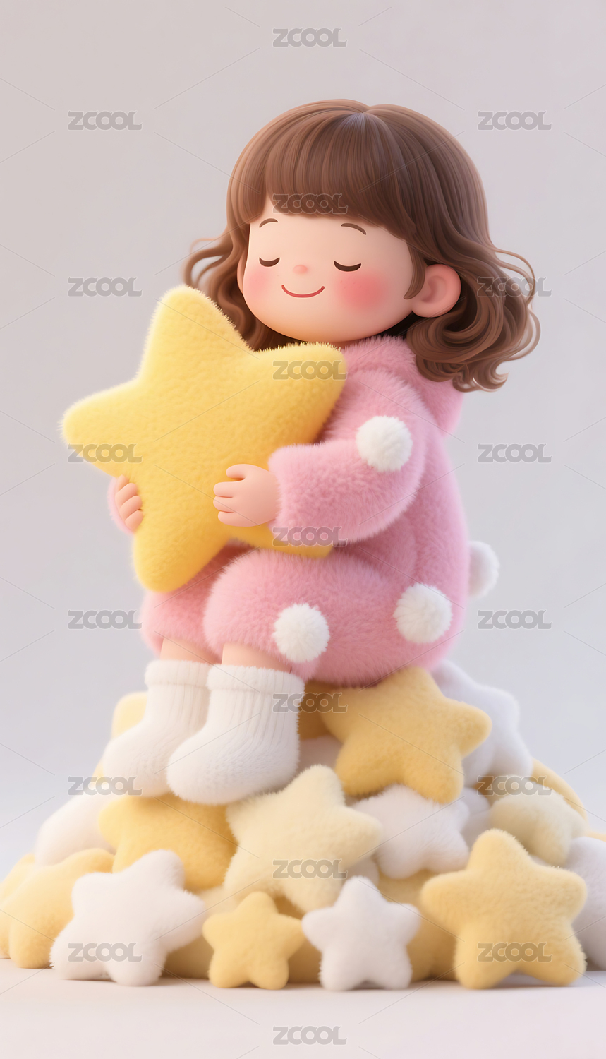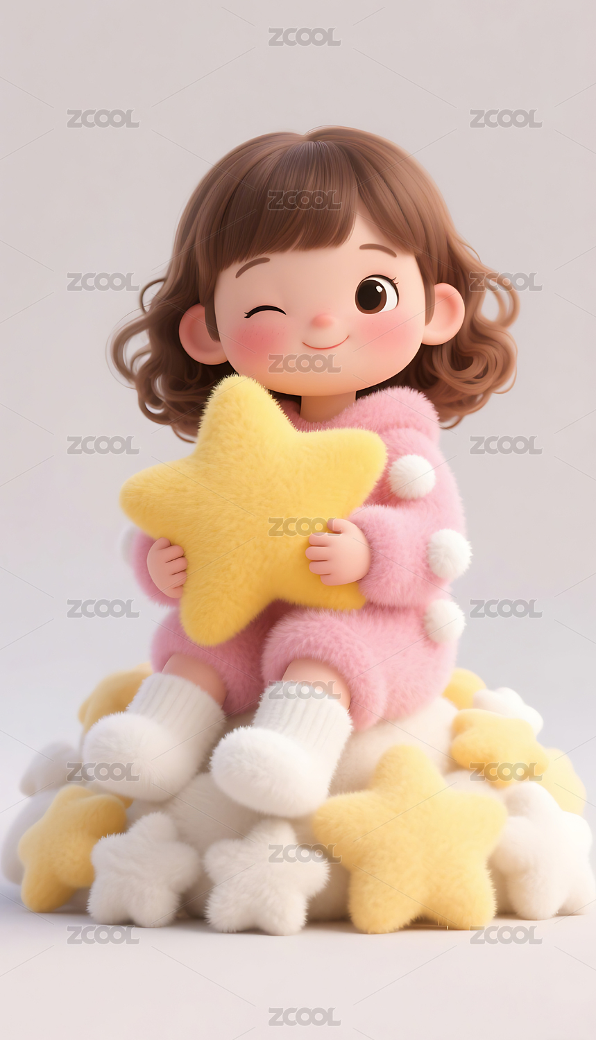 3D羊毛毡毛绒绒风格小女孩抱着星星模型