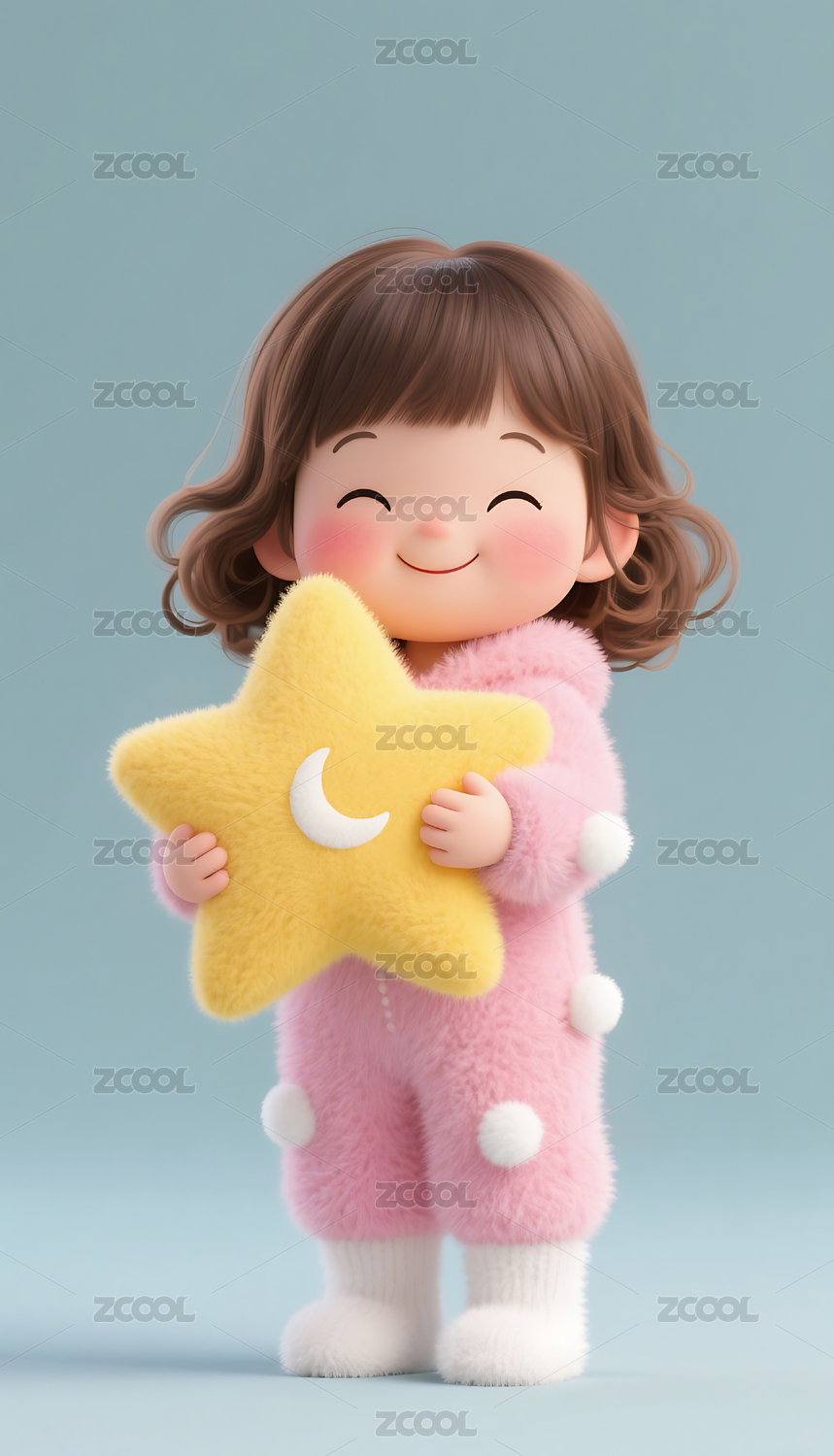 3D羊毛毡毛绒绒风格小女孩抱着星星模型
