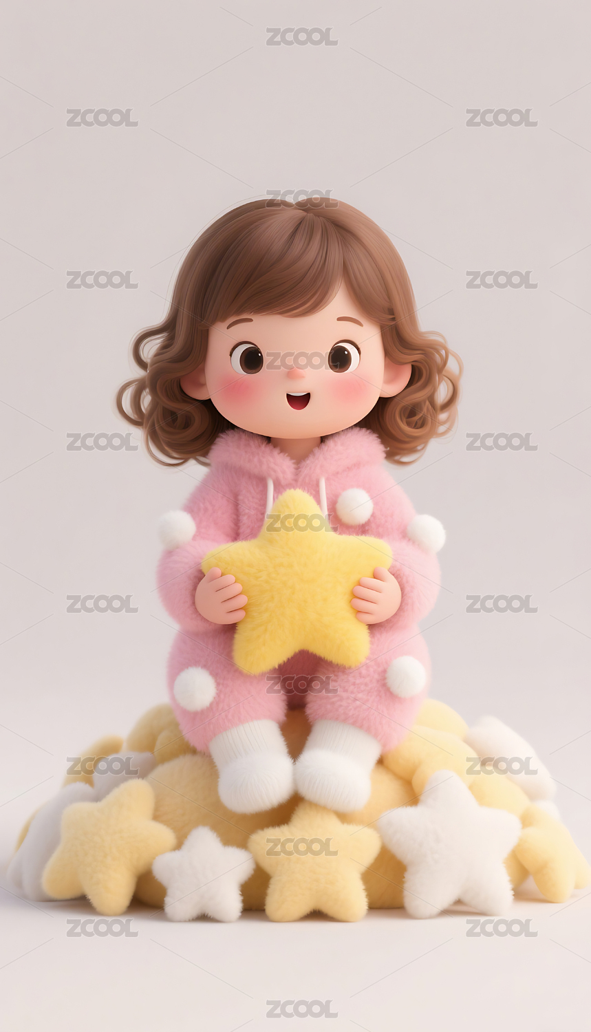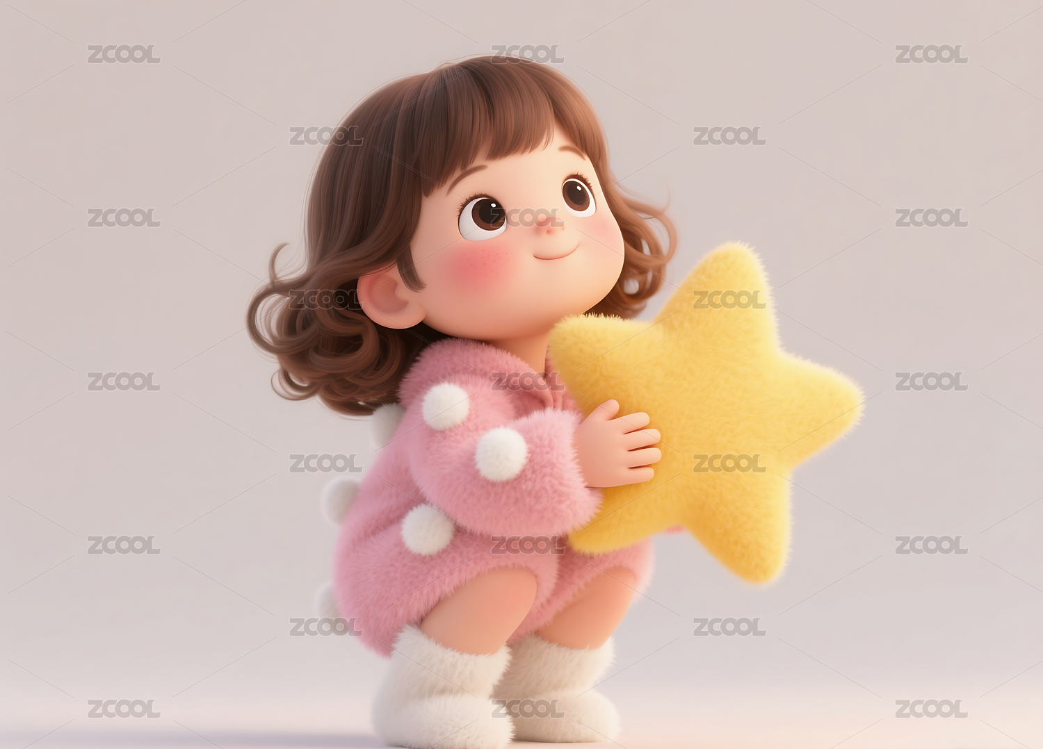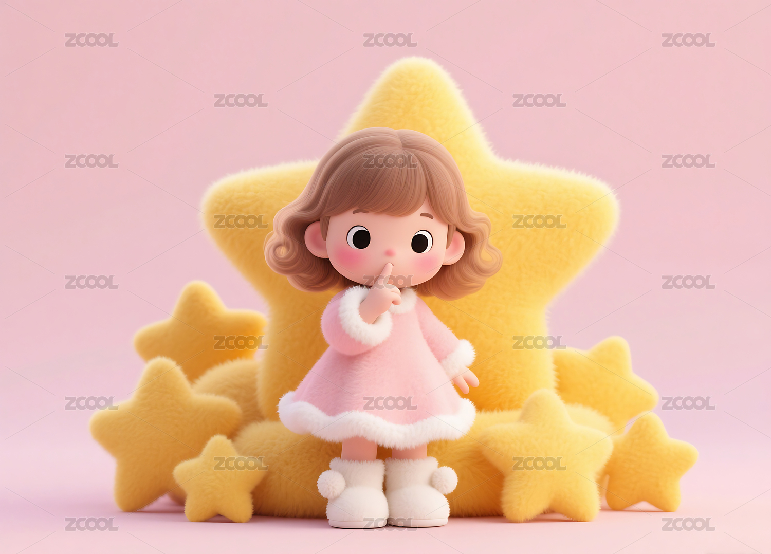 3D羊毛毡毛绒绒风格小女孩抱着星星模型