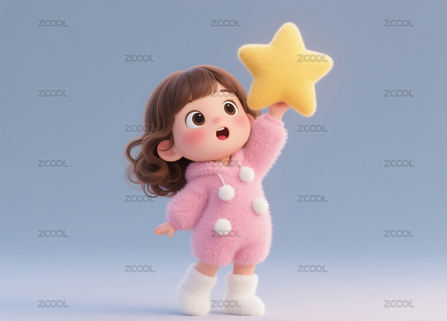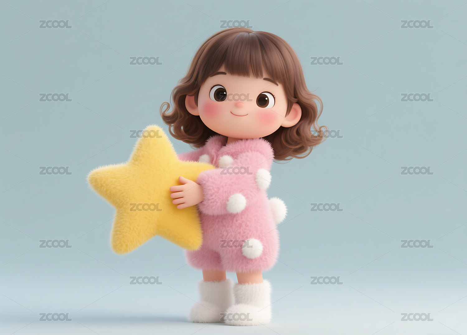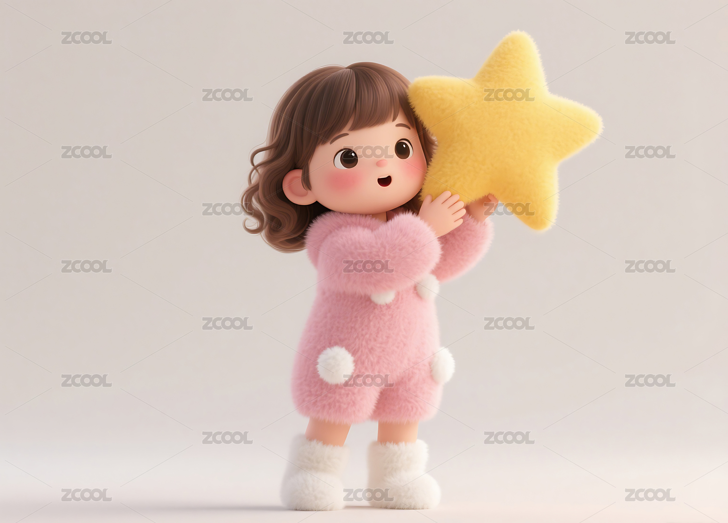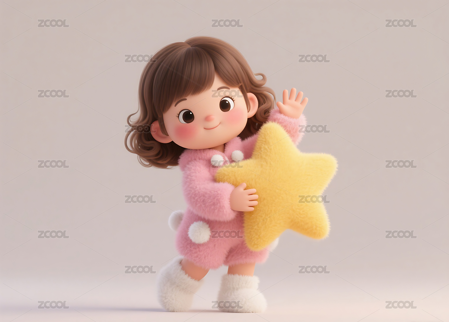 3D羊毛毡毛绒绒风格小女孩抱着星星模型