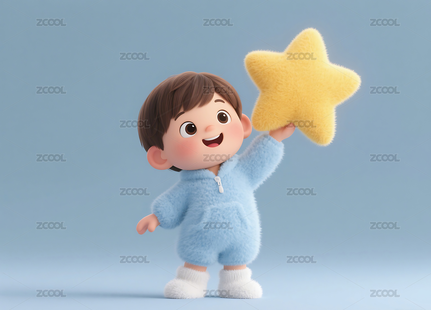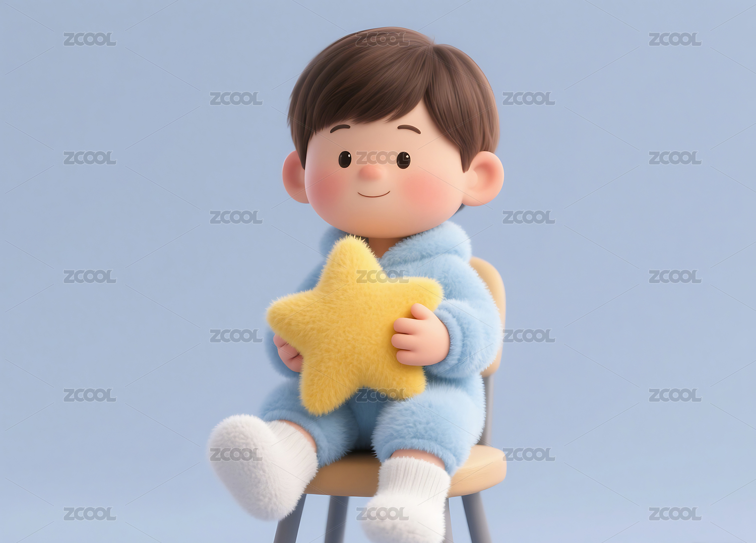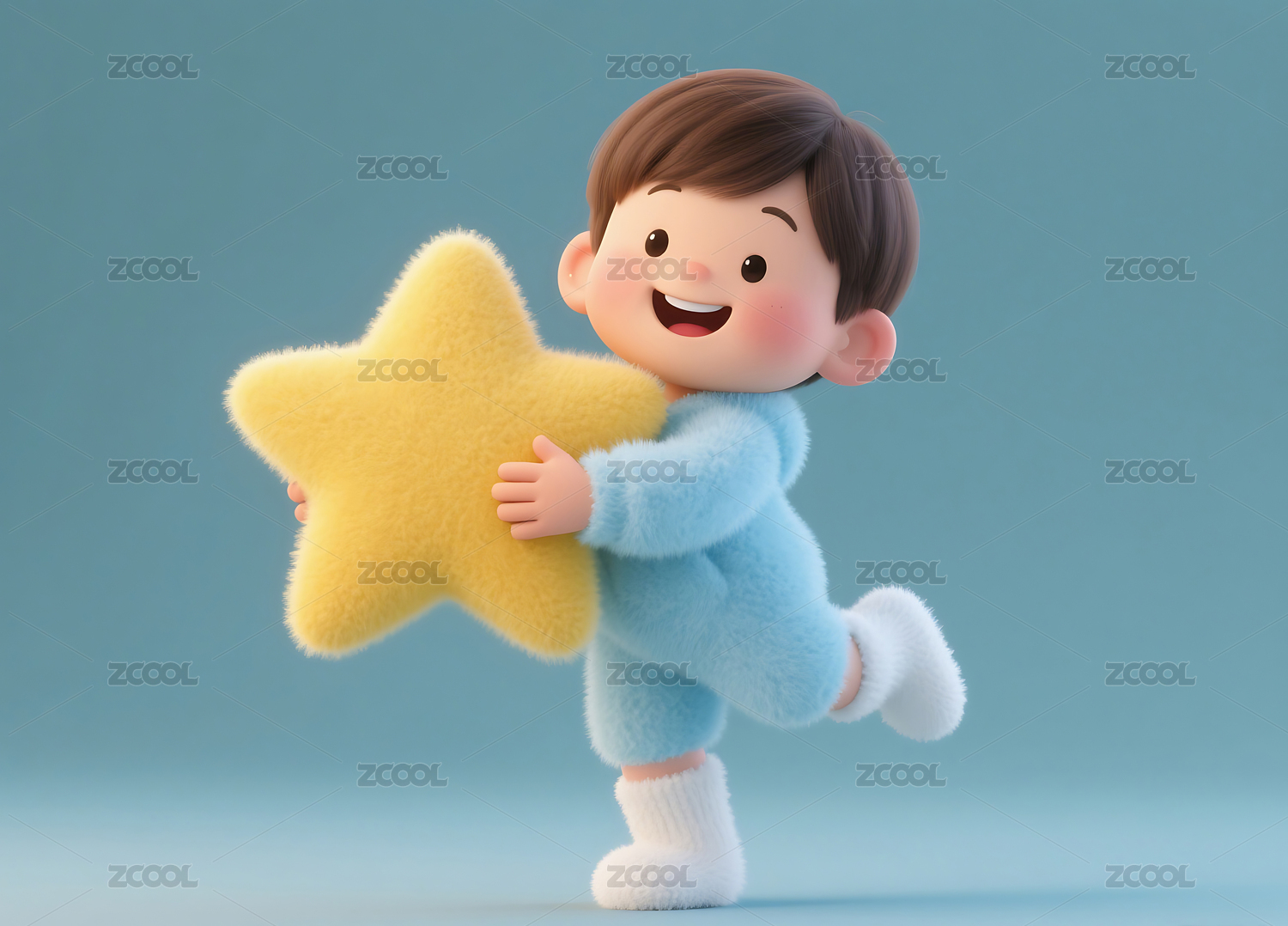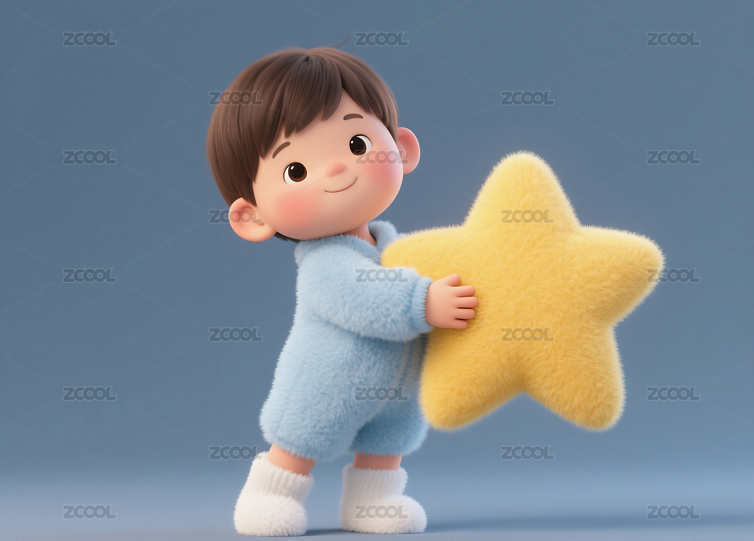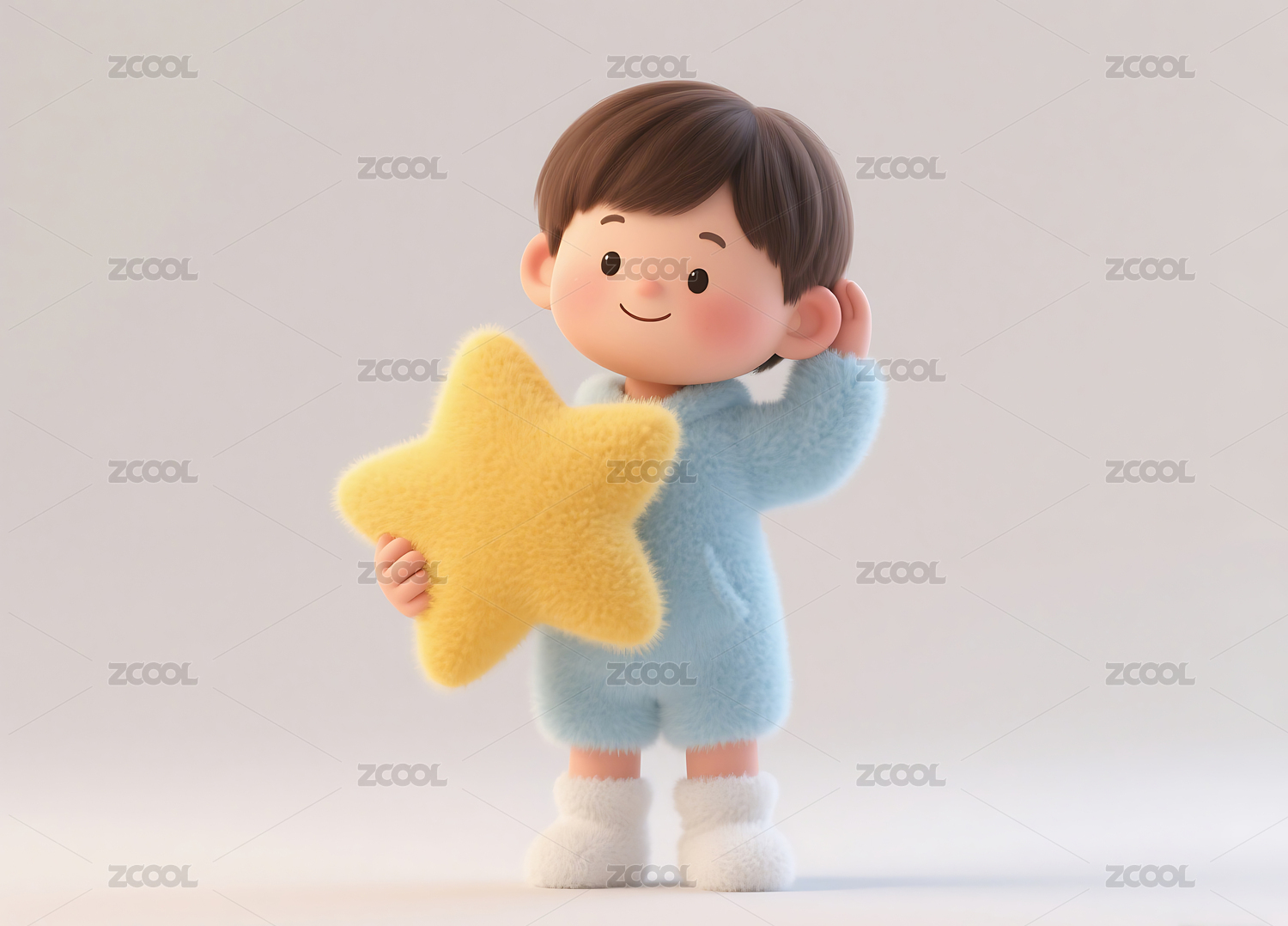 3D羊毛毡毛绒绒风格小男孩抱着星星模型