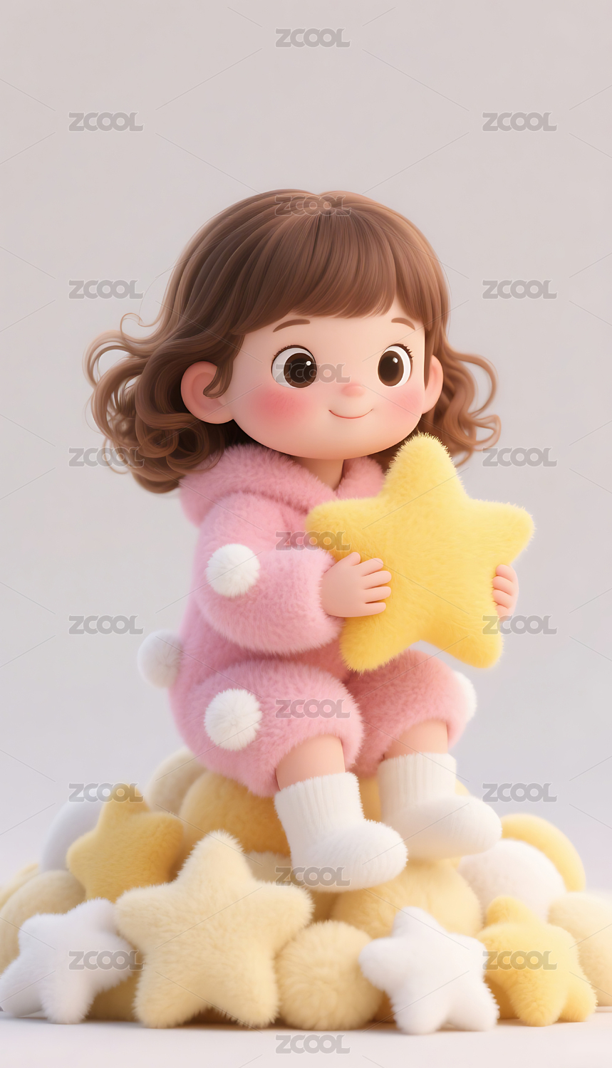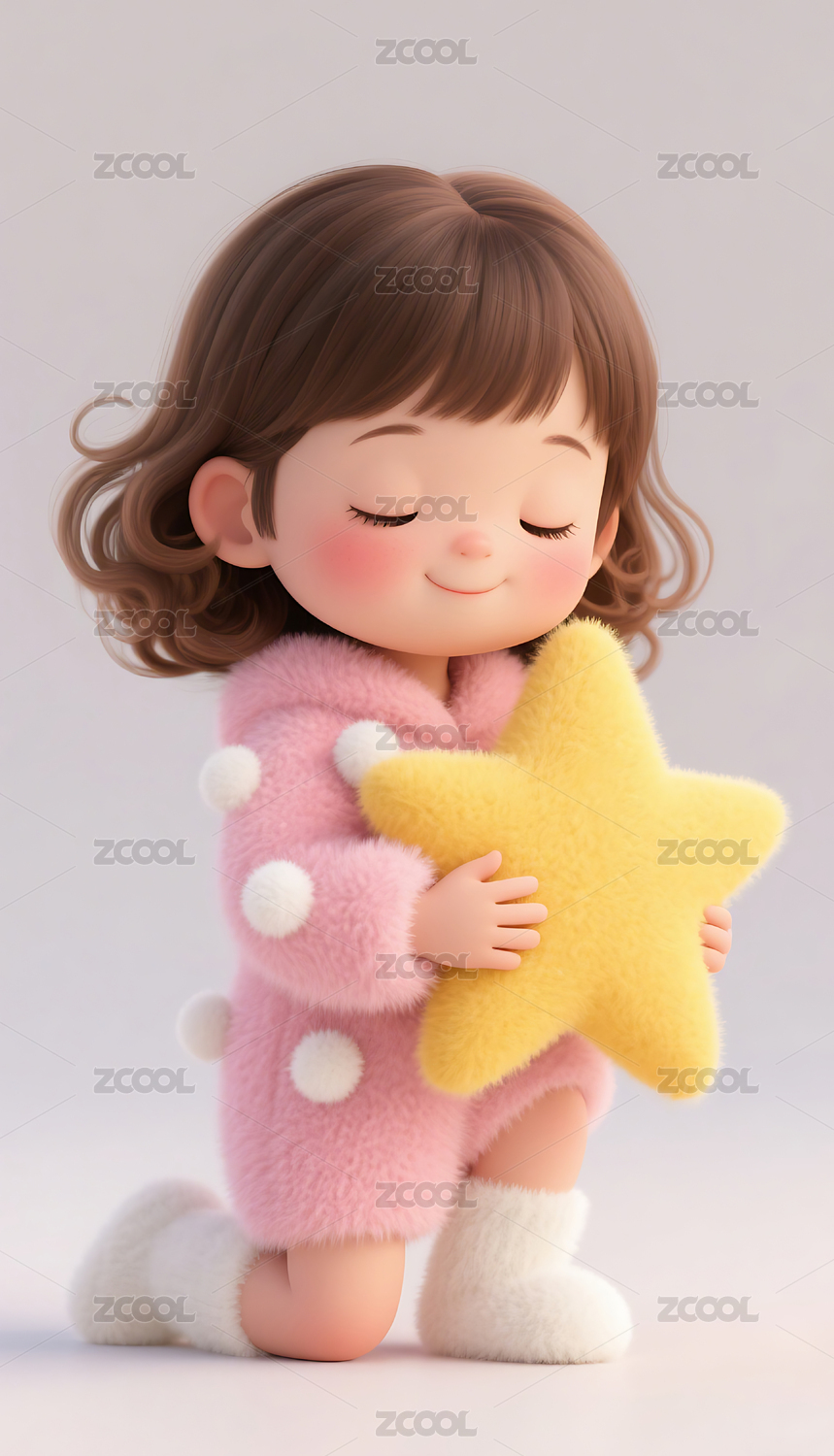 3D羊毛毡毛绒绒风格小女孩抱着星星模型