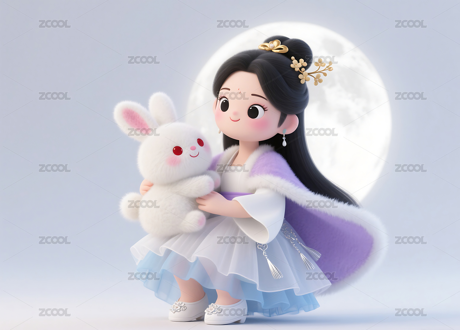 3D羊毛毡毛绒绒风格嫦娥玉兔月亮模型素材