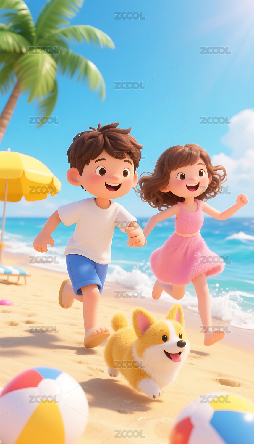 3D渲染立体情人节情侣海边沙滩追逐玩耍