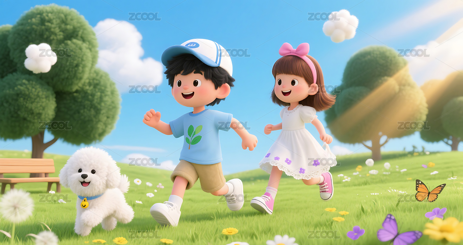 毛绒绒,毛茸茸,3D,插画,夏天,草地,植物,狗,男孩,女孩