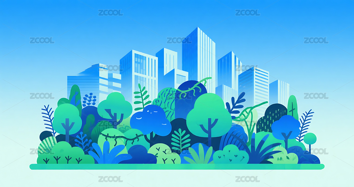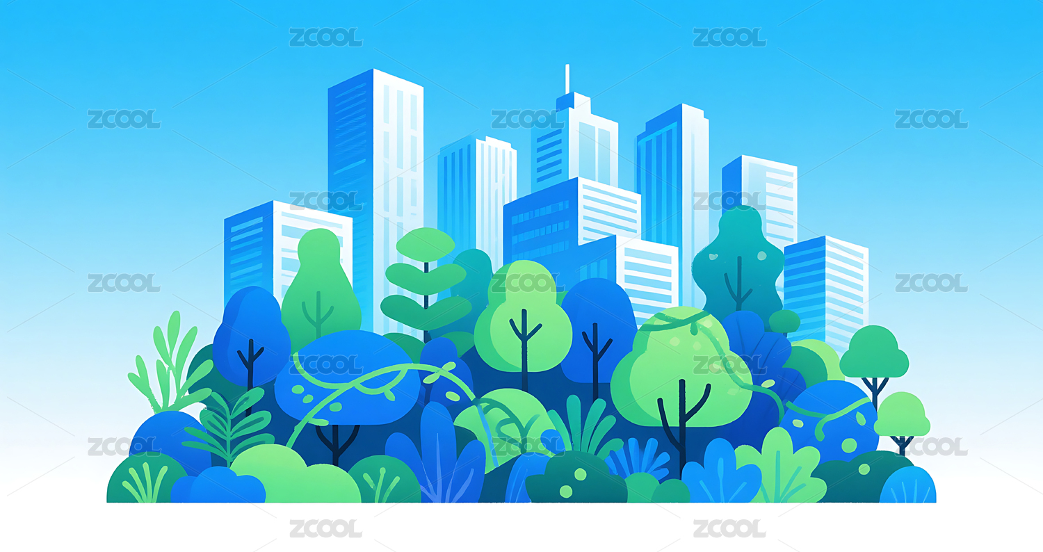 蓝色,绿色,植物,城市,建筑,插画,扁平风格,平面,天空