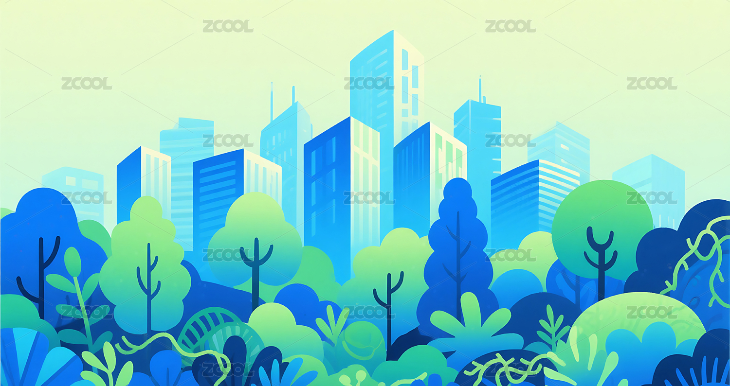 蓝色,绿色,植物,城市,建筑,插画,扁平风格,平面,天空