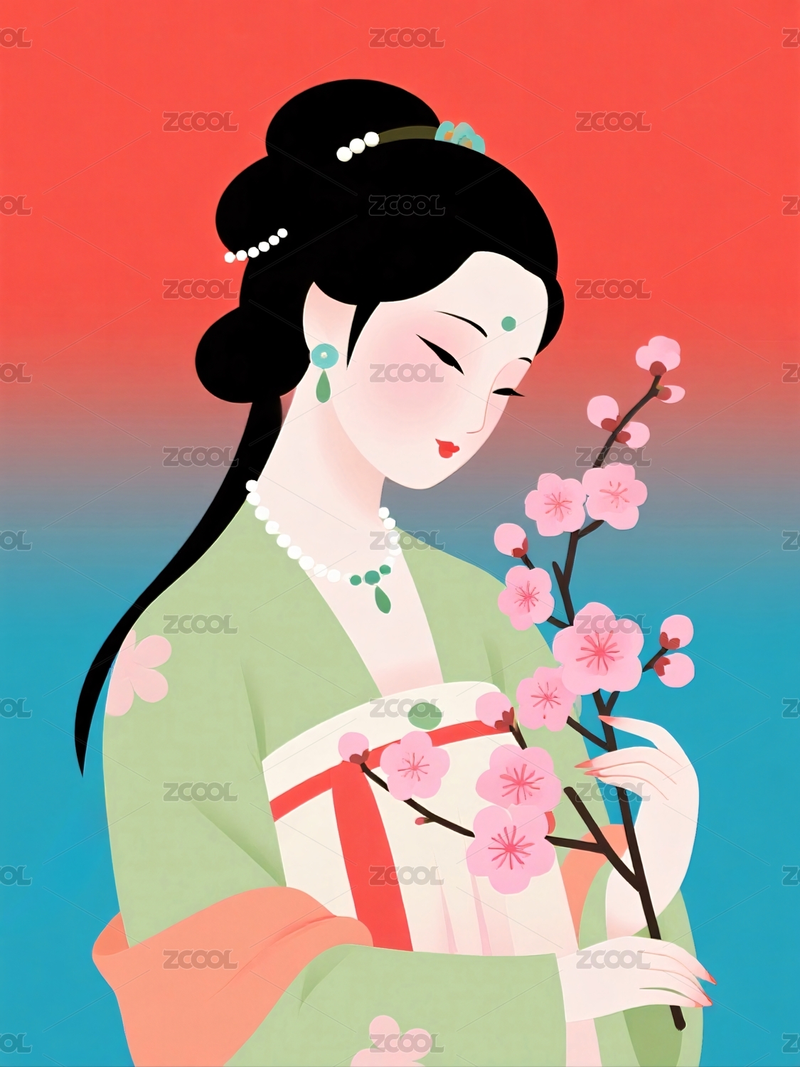 女子手持梅花红底图
