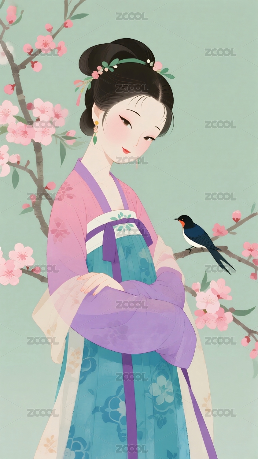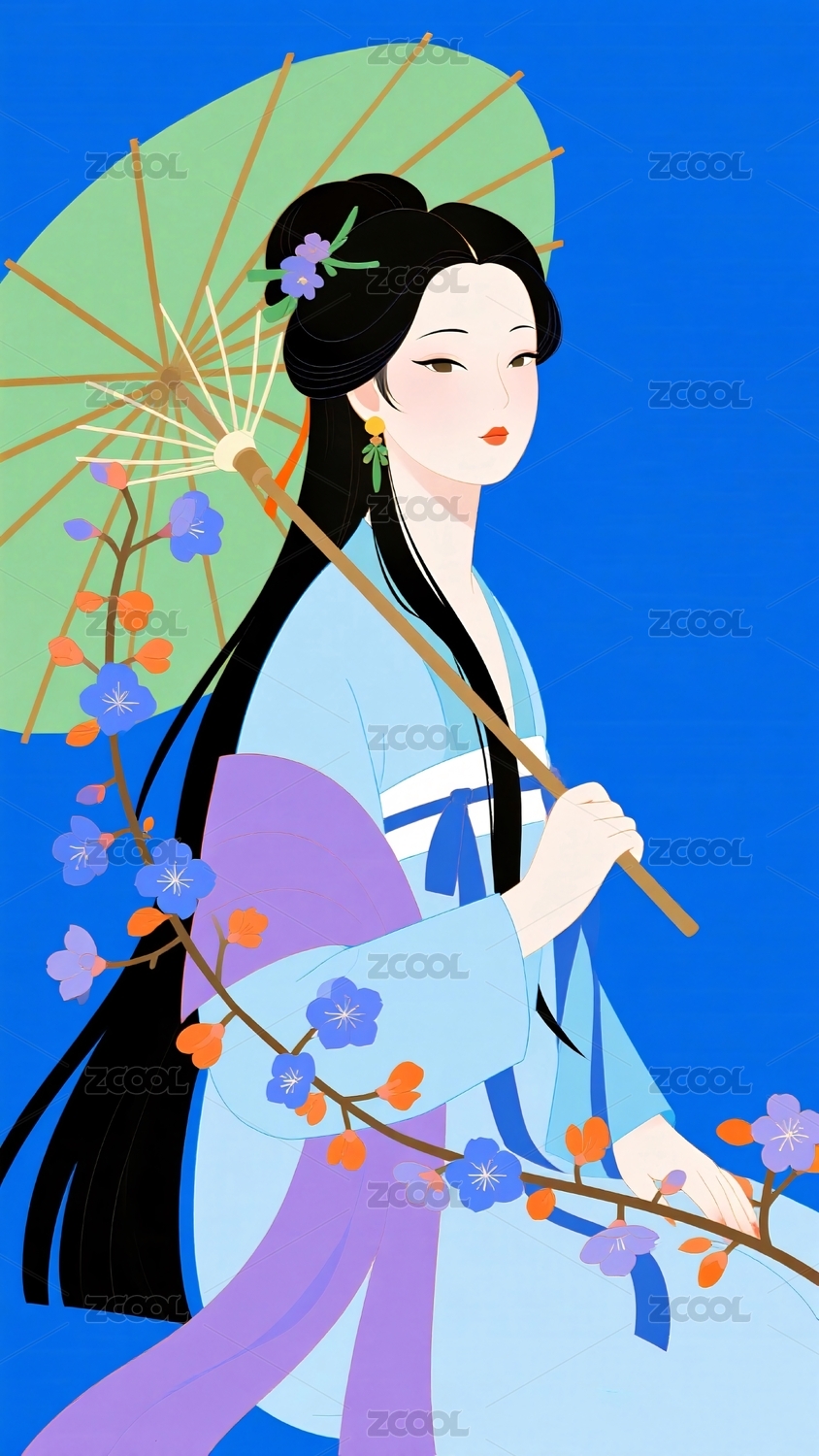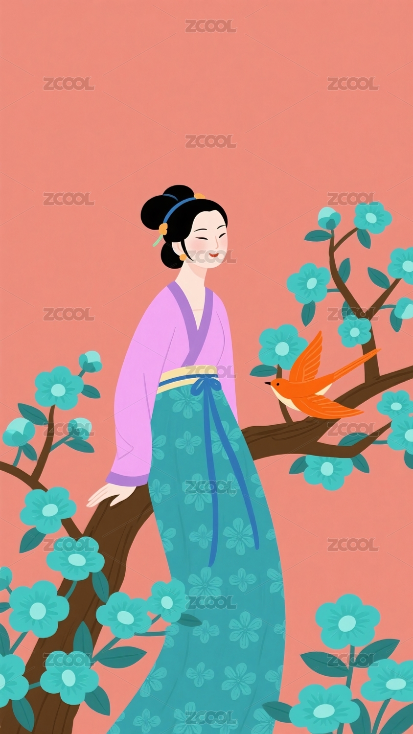 人物,飞鸟,蓝衣,花朵,长发,简约,红色,古典,柔美,优雅