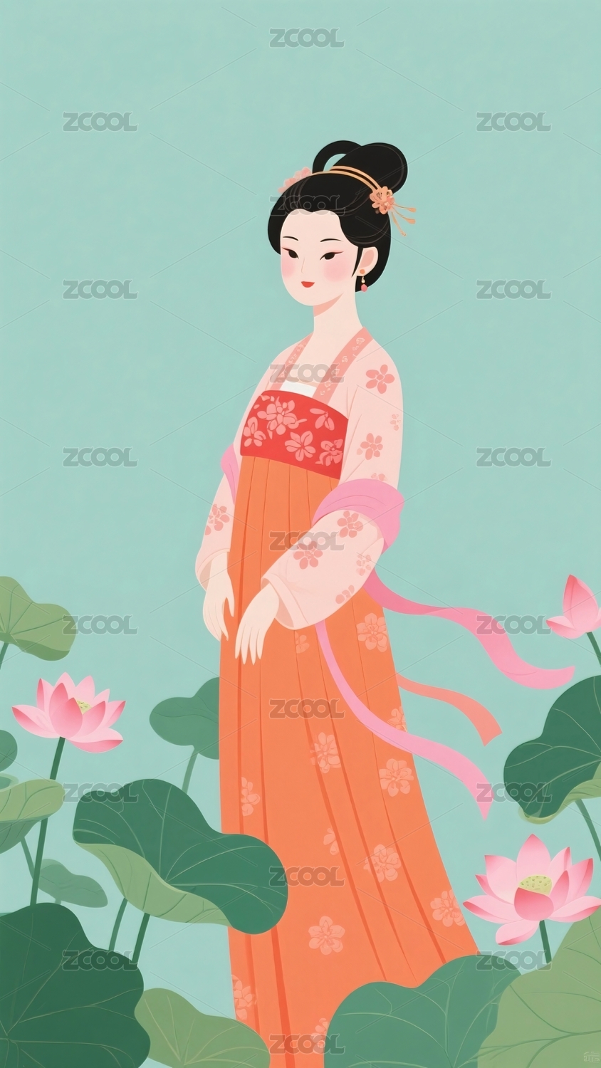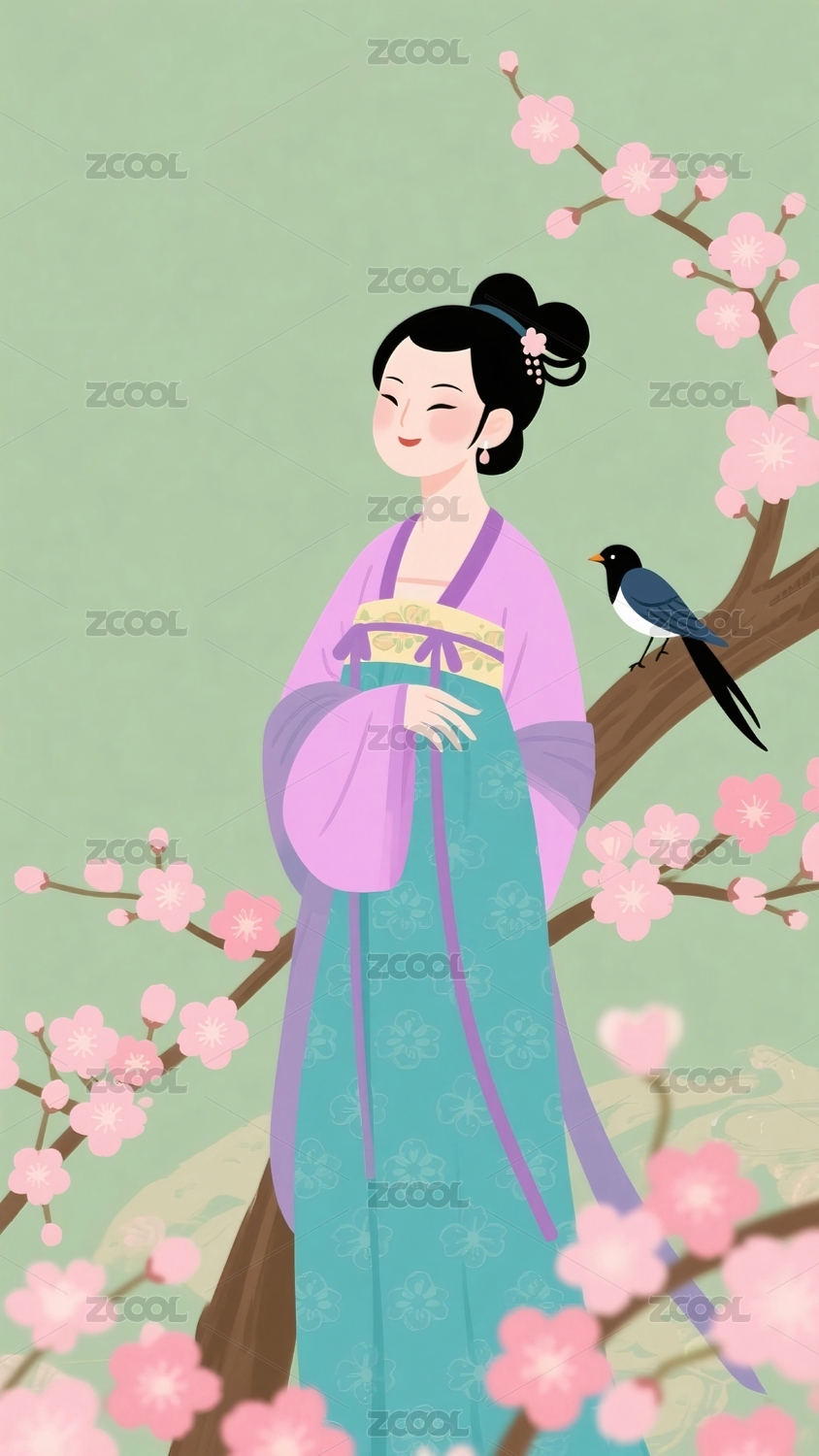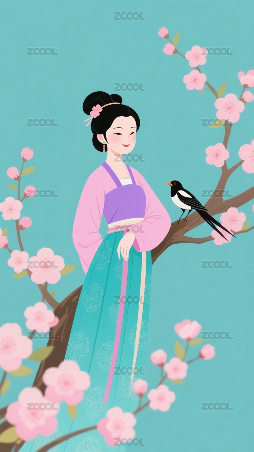 人物,飞鸟,蓝衣,花朵,长发,简约,红色,古典,柔美,优雅