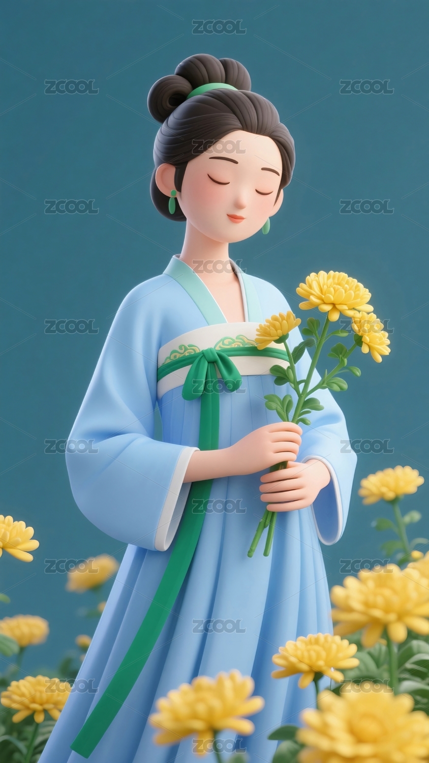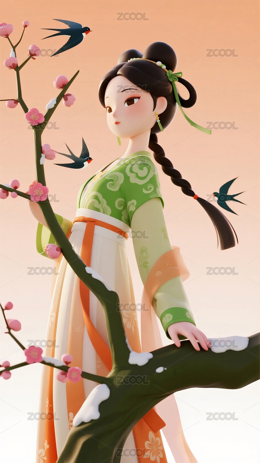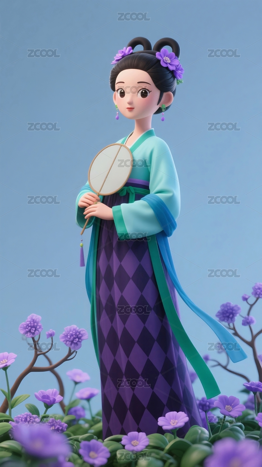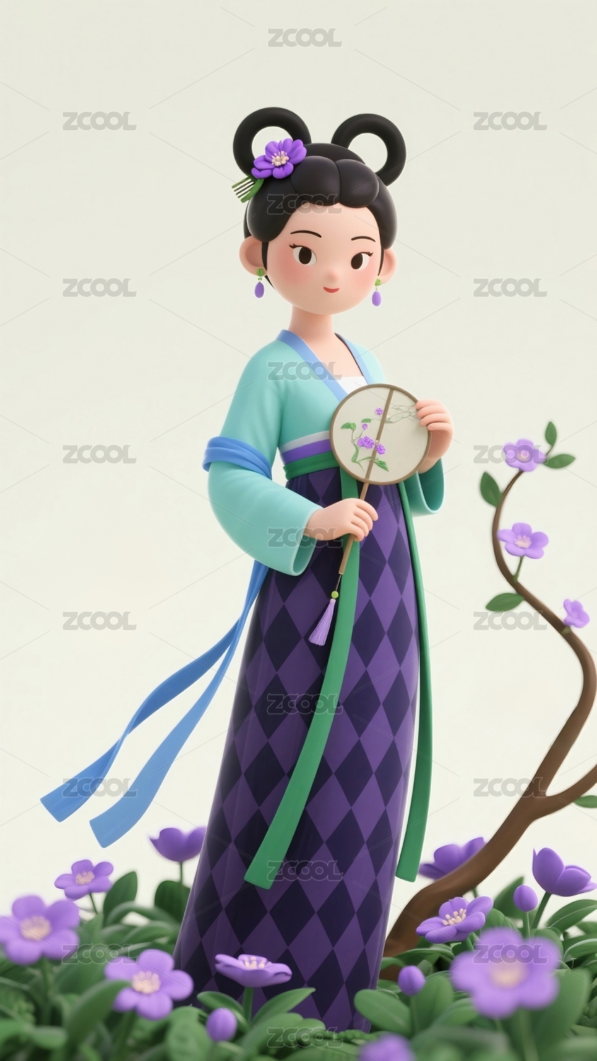 人物,绿色,紫色,裙子,眼睛,微笑,花朵,卡通,树枝,可爱