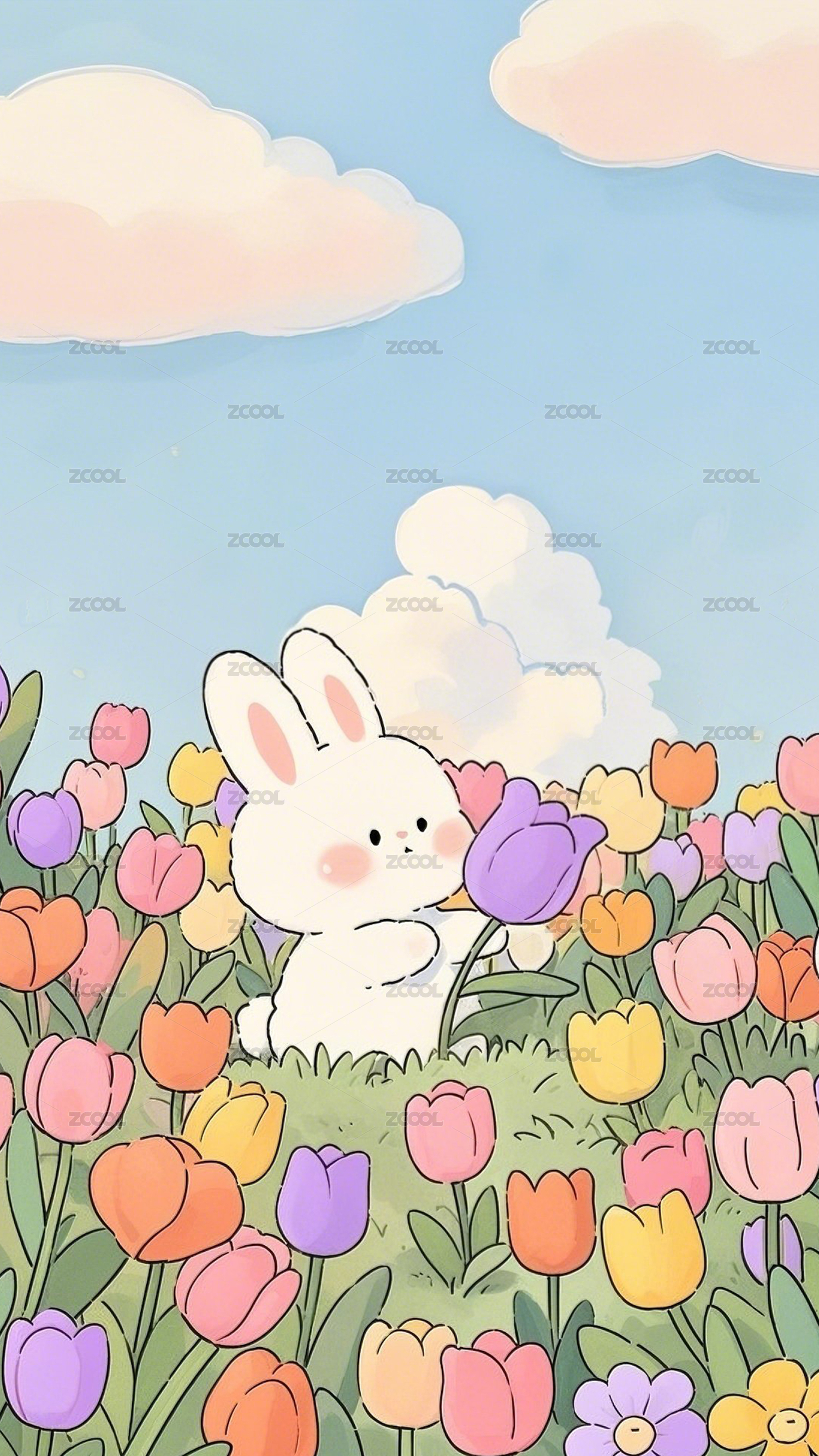 可爱小兔子手捧鲜花粉色背景治愈壁纸
