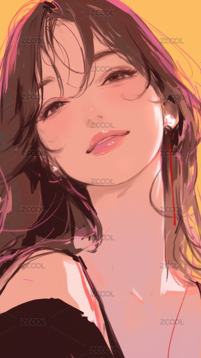 夏天黑头发黄皮肤东方女性头像扁平插画绘画