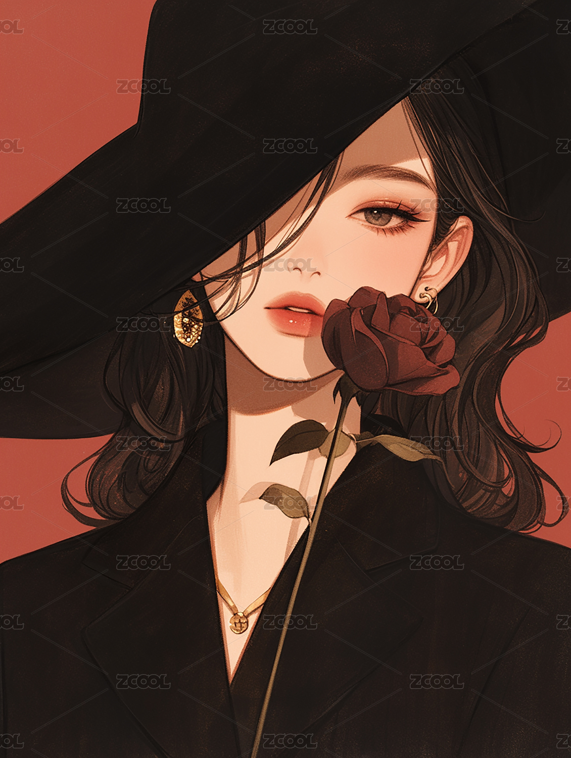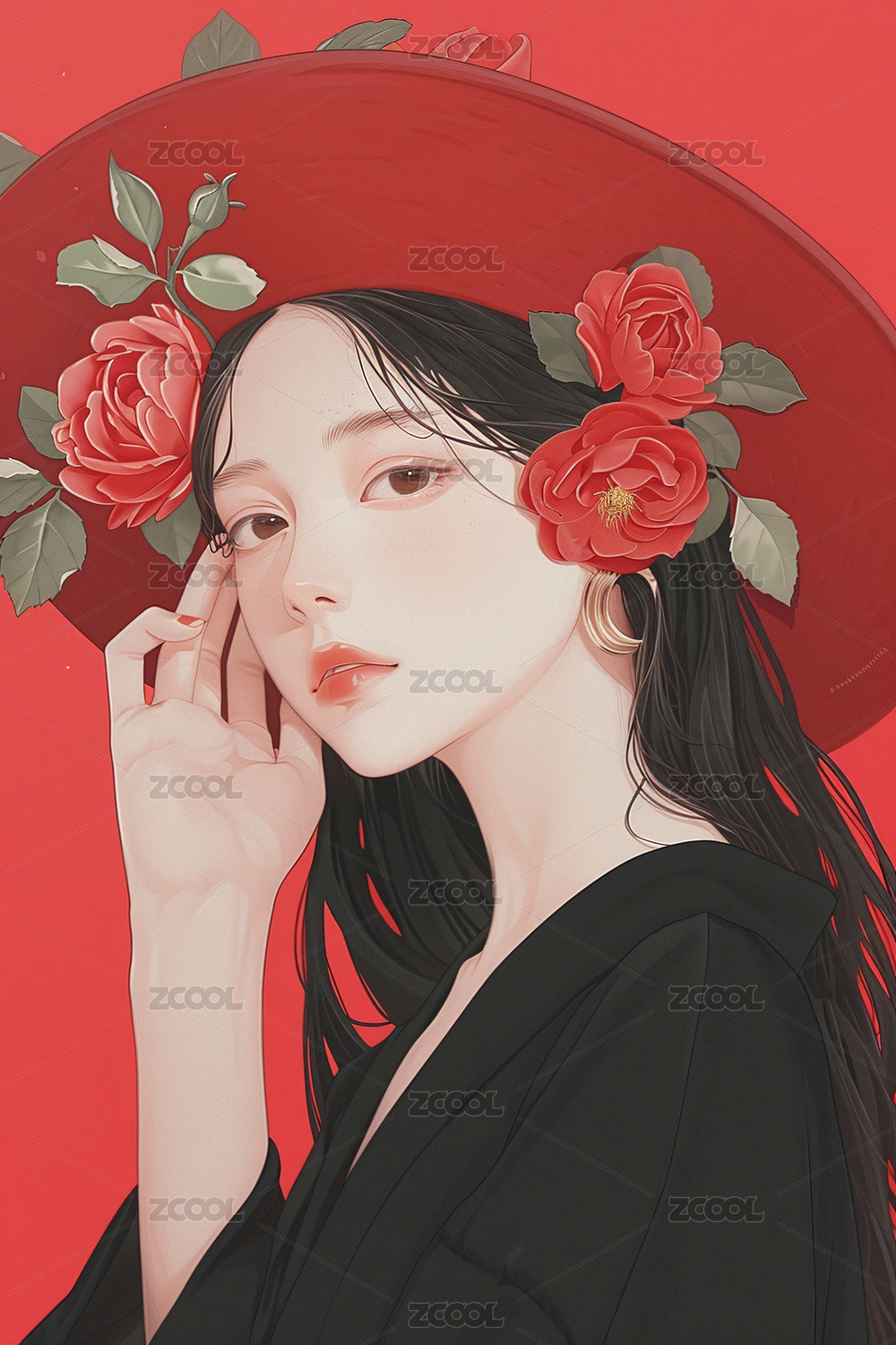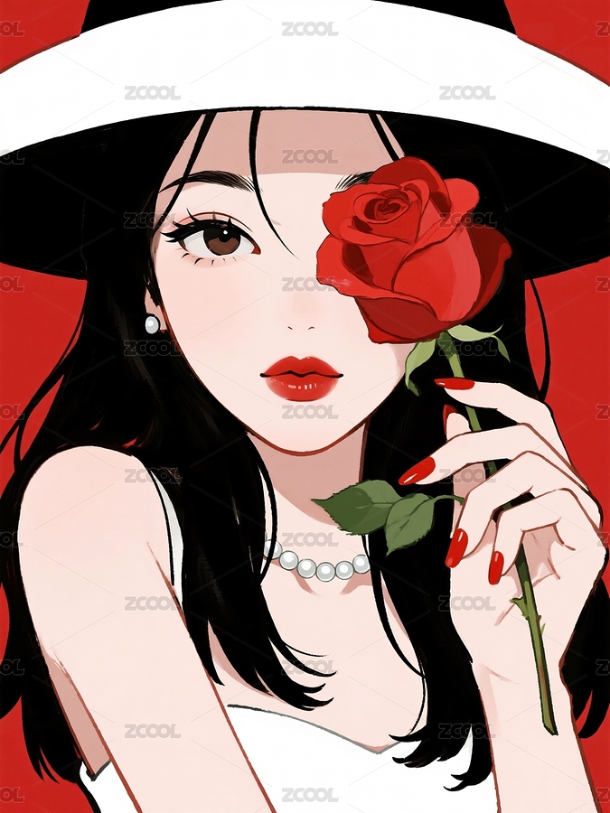红色,白色,时尚,黑发,红唇,女子,美丽,优雅,唯美,人物