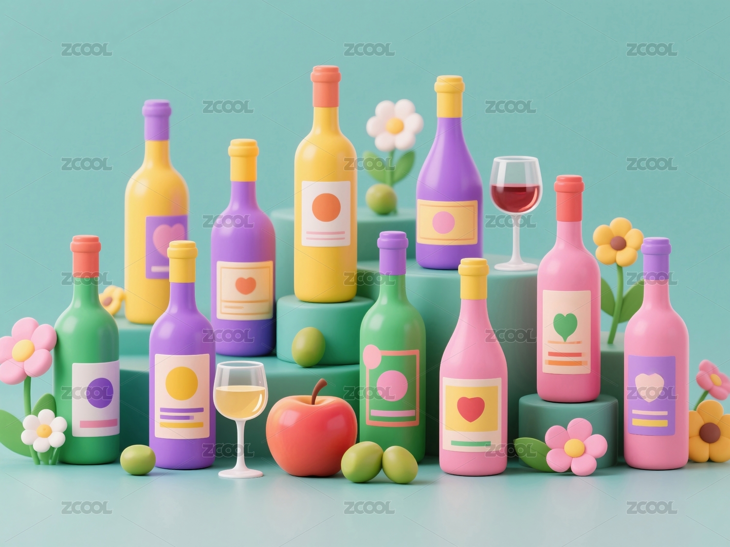 彩色,粉色,绿色,黄色,装饰,颜色,红酒,瓶子,酒杯,饮料
