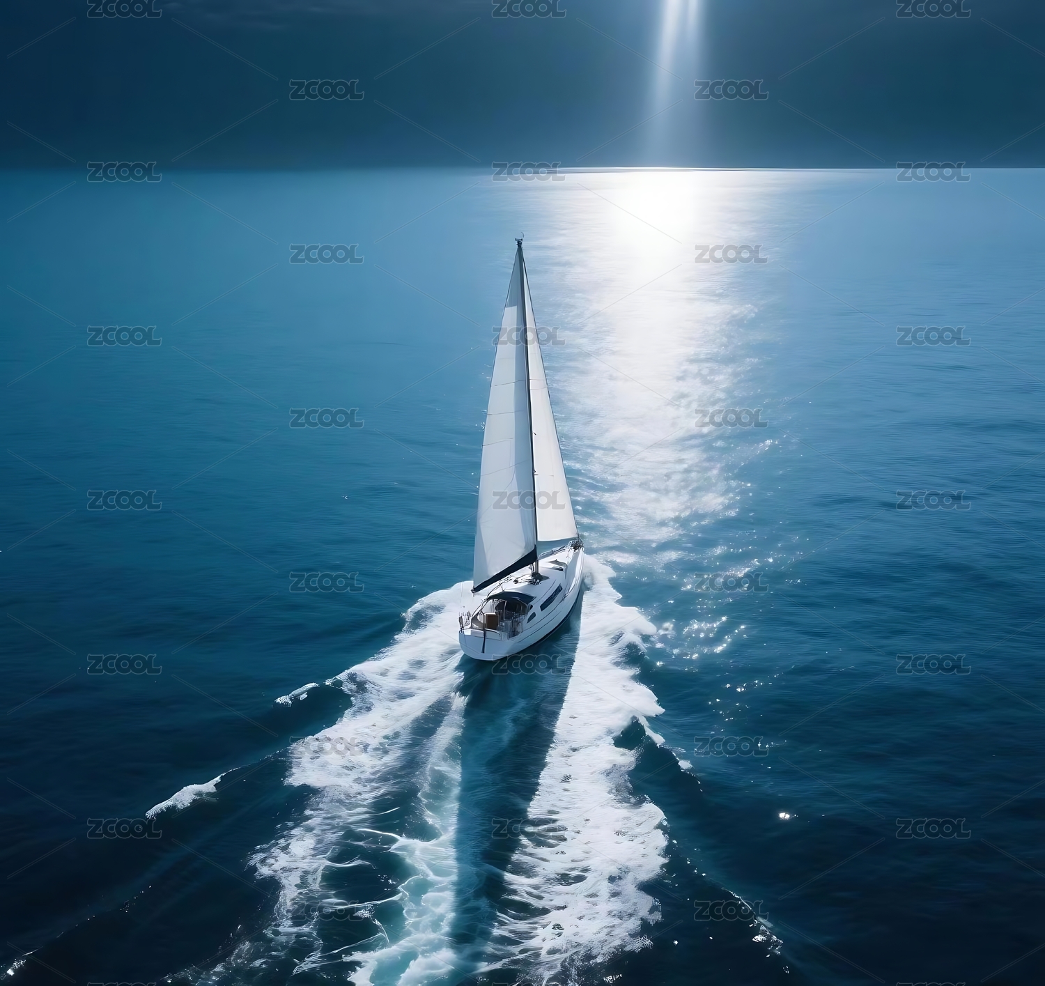 阳光照耀下的帆船航行在青蓝海面上