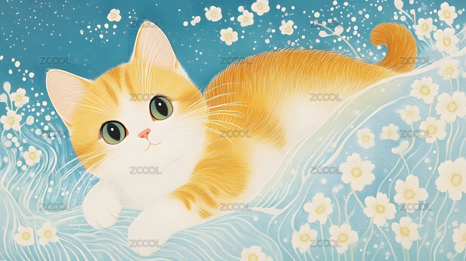 治愈系,猫咪,戏水,插画,装饰,背景,素材,艺术,清新,自然