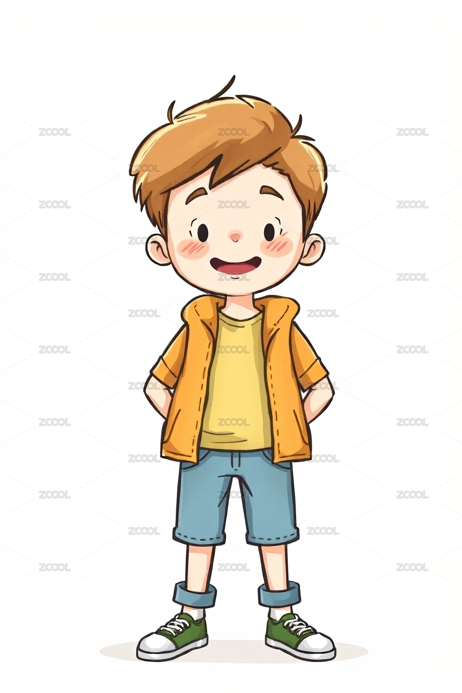 穿着黄色夹克和蓝色牛仔裤的卡通男孩双手插