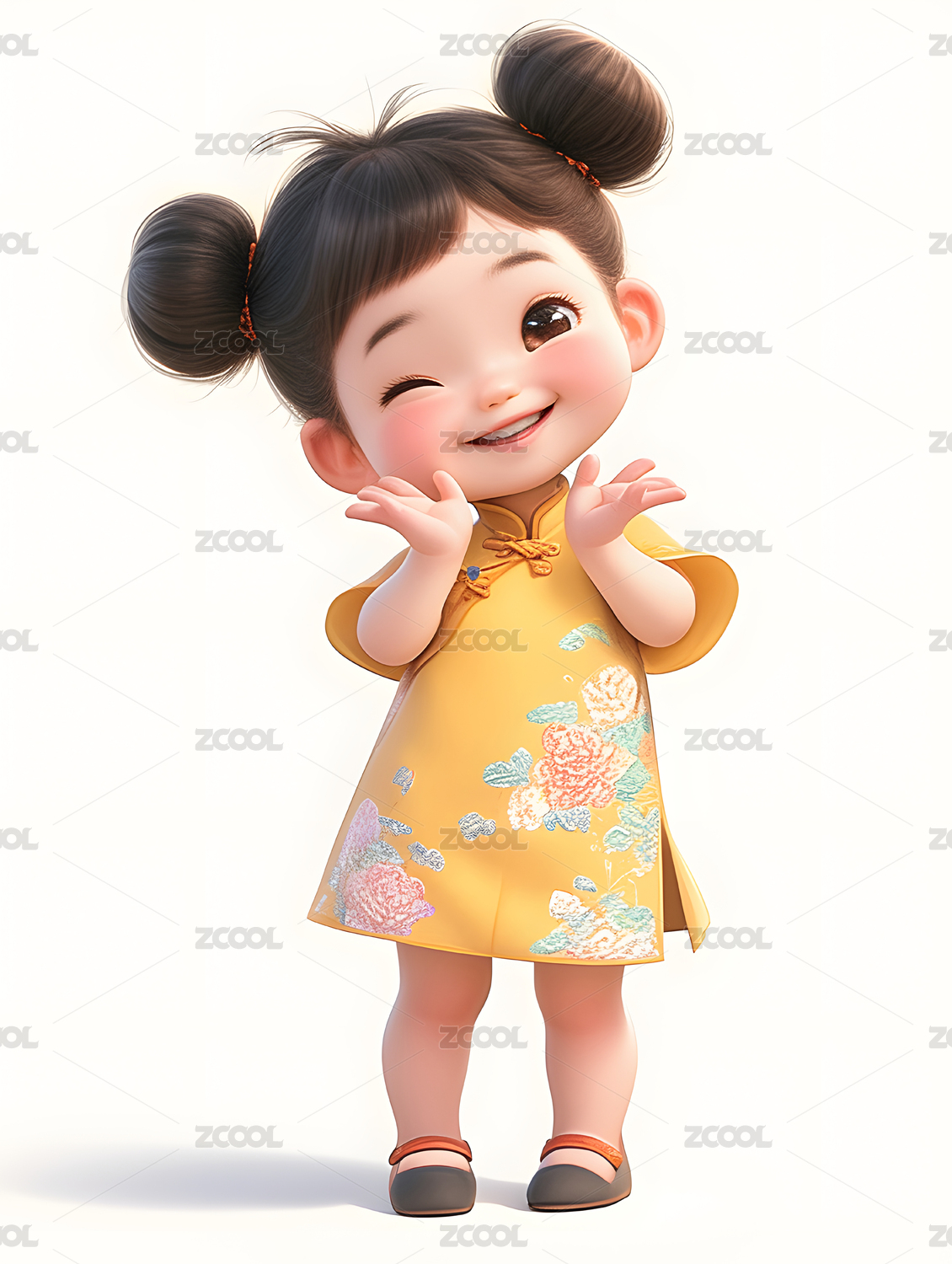 双丸子头卡通黄衣萌娃祈福可爱女孩3D插画