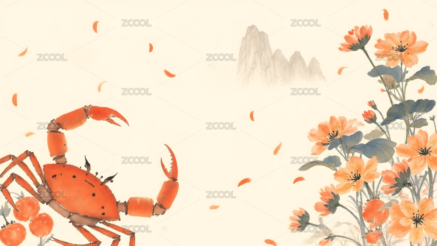中国画大闸蟹秋天菊花古风水墨螃蟹插画