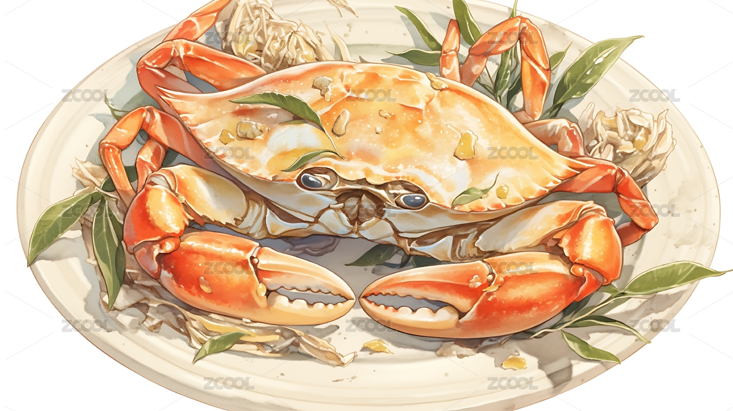 螃蟹,河鲜,美食,插画,荷莲,餐盘,水生,花卉,甲壳,美味