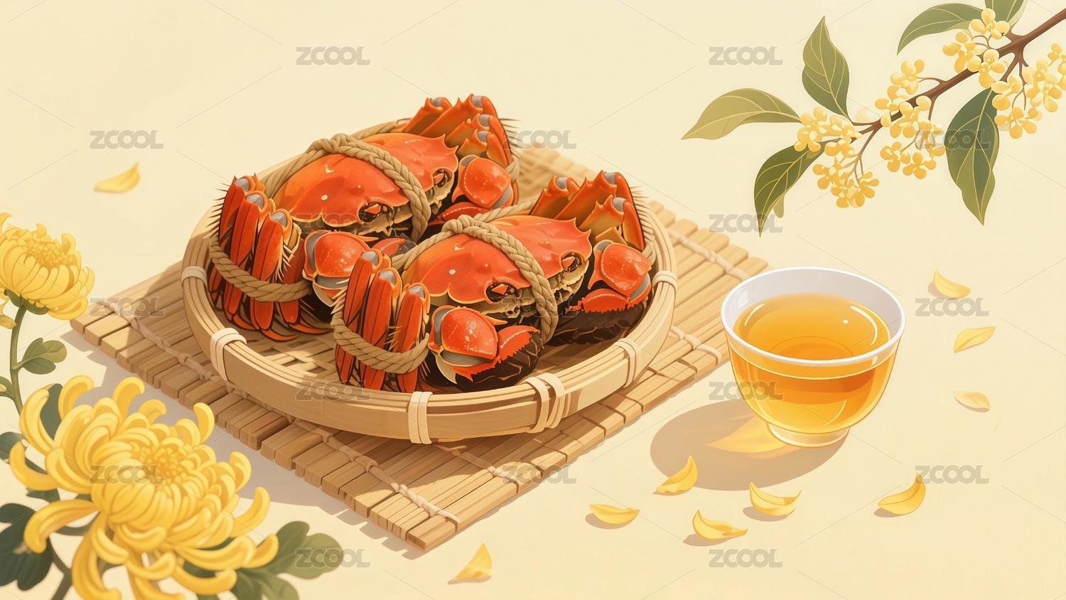 大闸蟹菊花黄酒插画背景壁纸