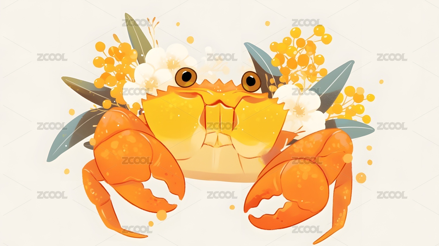卡通可爱螃蟹和桂花中秋节插画