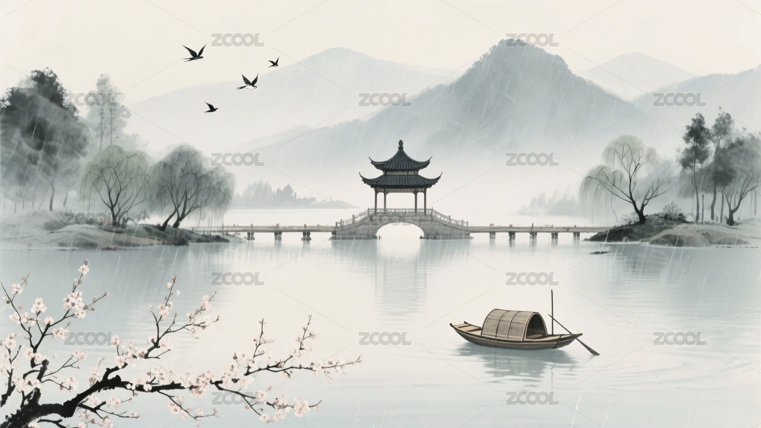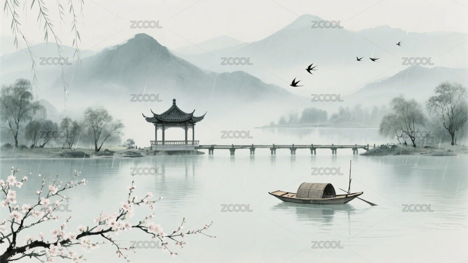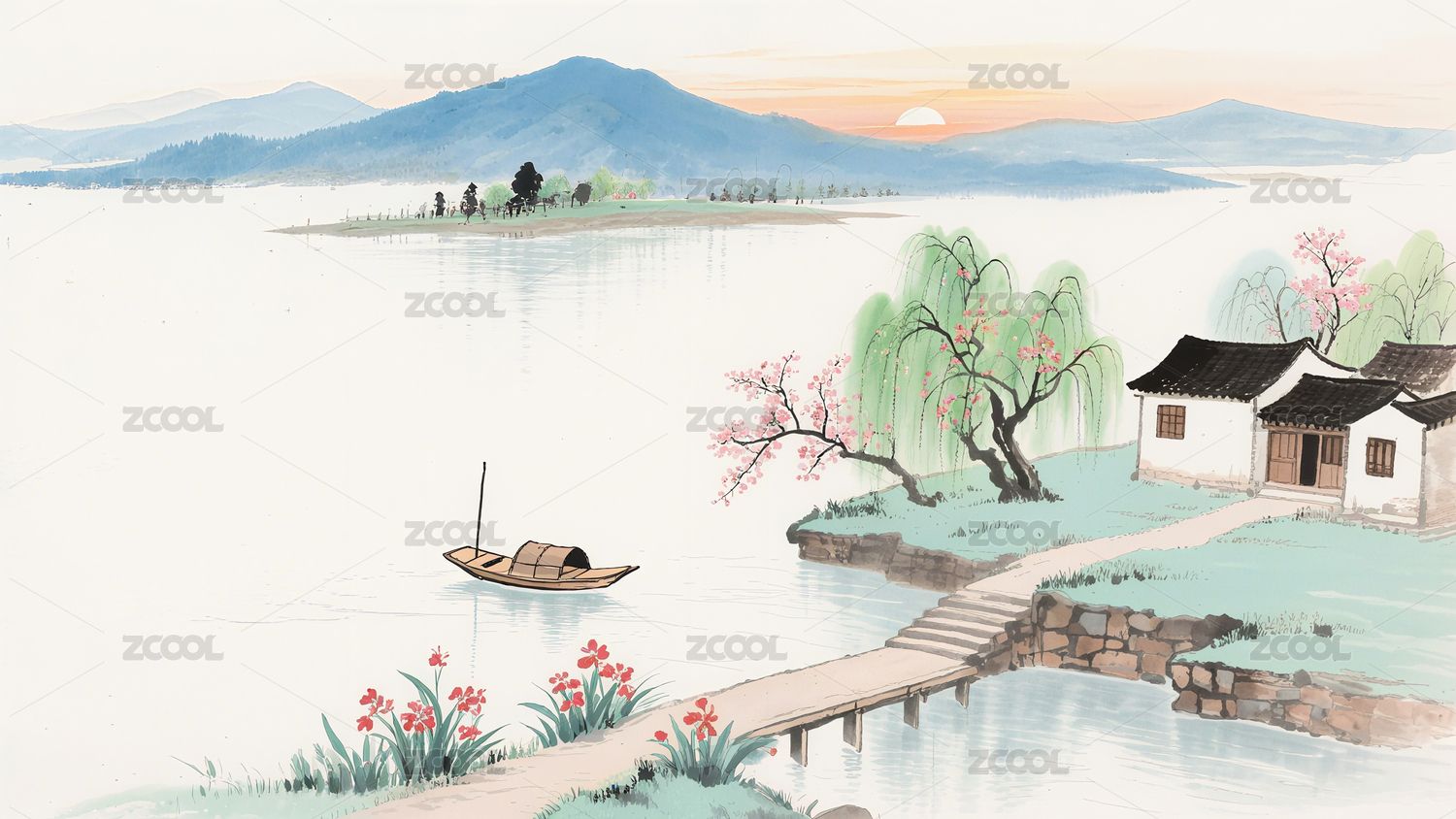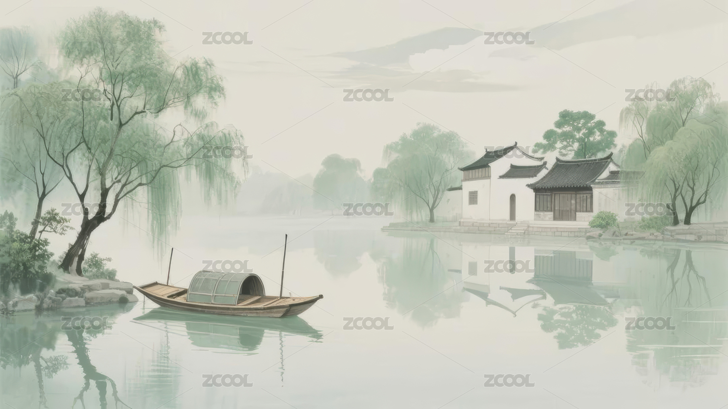 宁静,淡雅,留白,艺术,小船,中国风,河流,朦胧,山水,水墨画