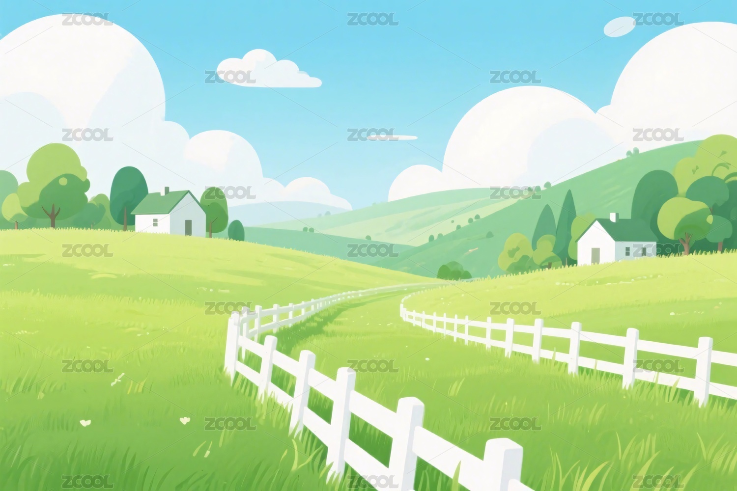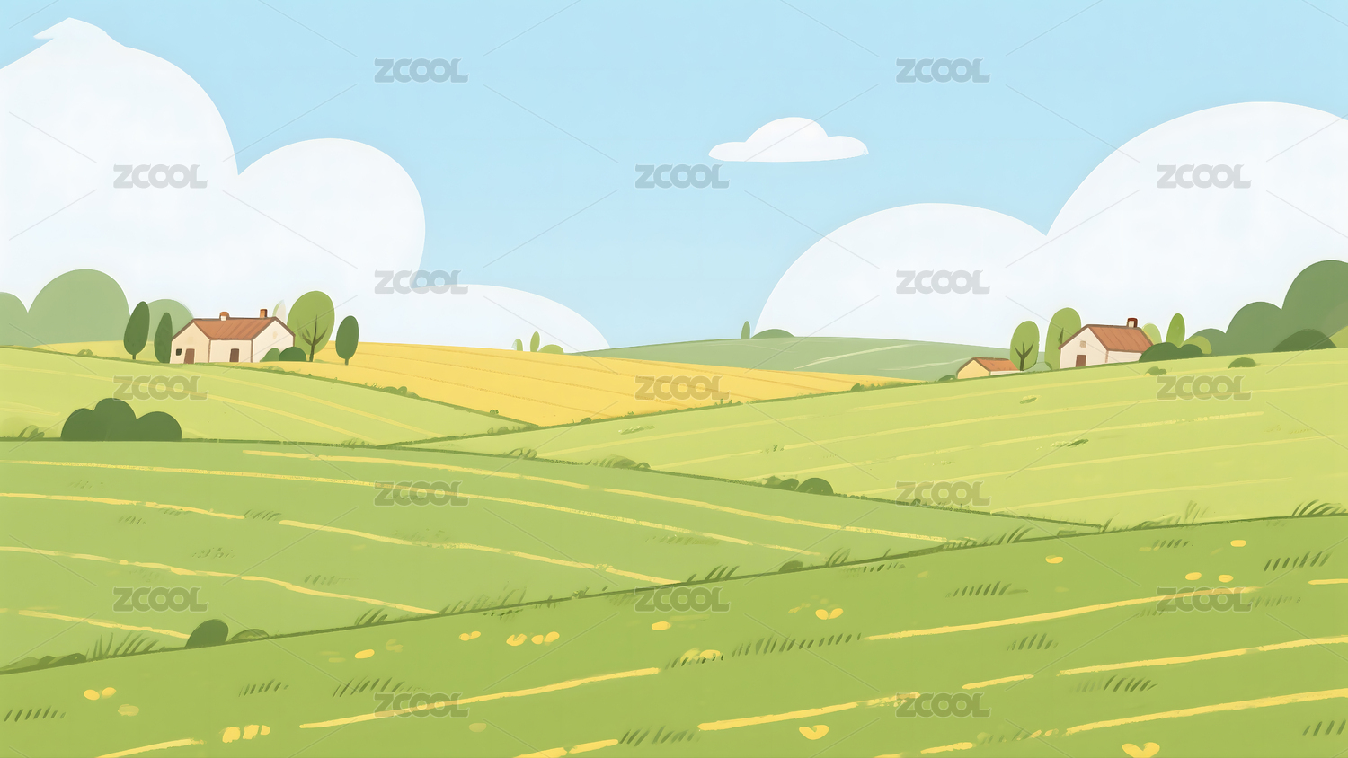 风景,乡村,树木,田野,田园风光,乡村景色,蓝天白云,阳光,卡通,插画