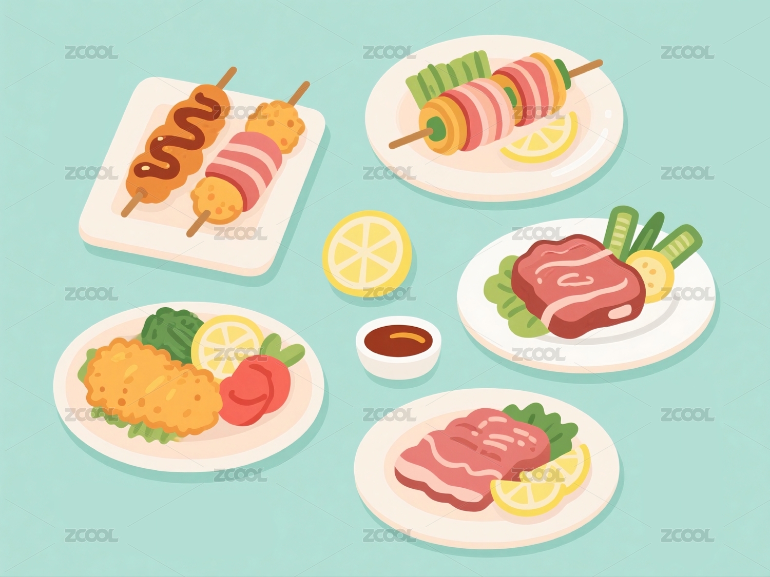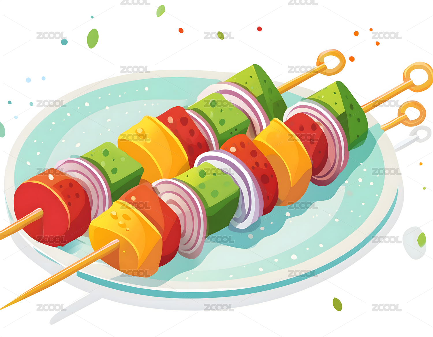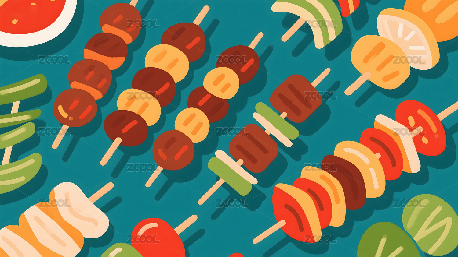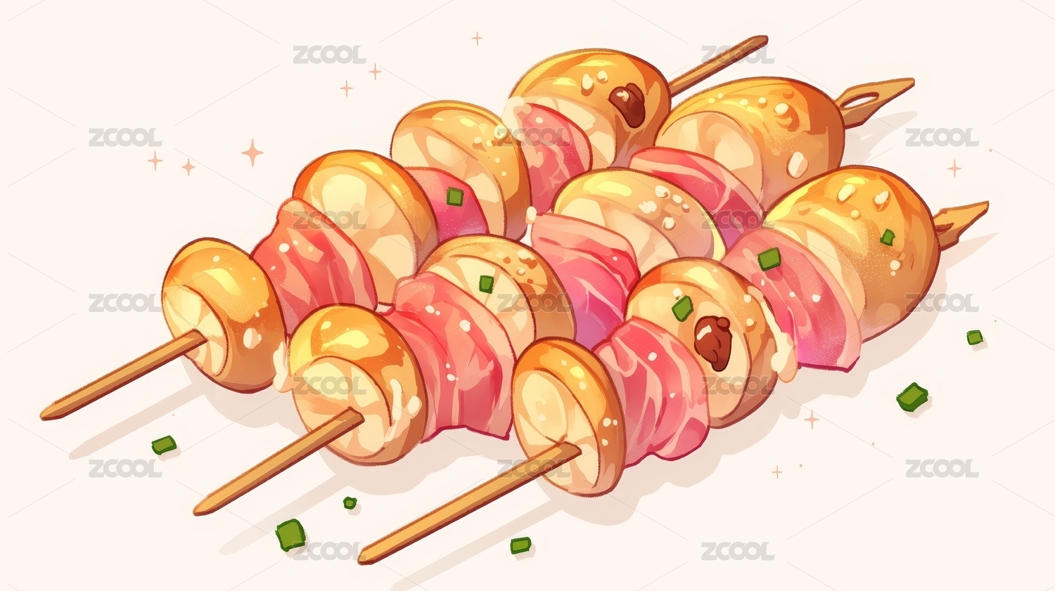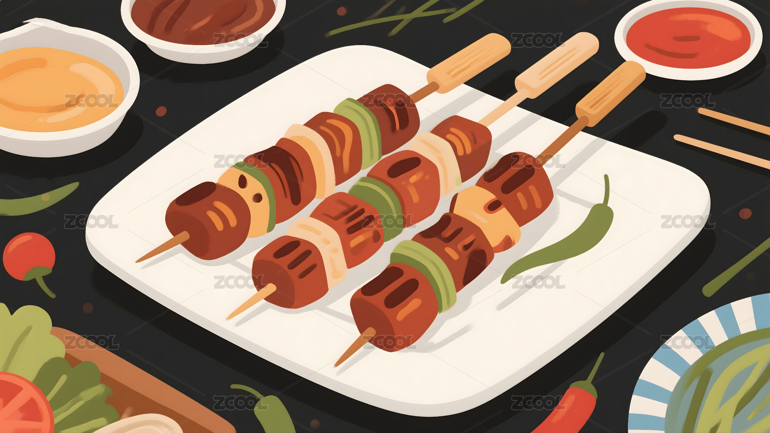 桌面盘中的烤串炸串肉串涮串插画绘画手绘