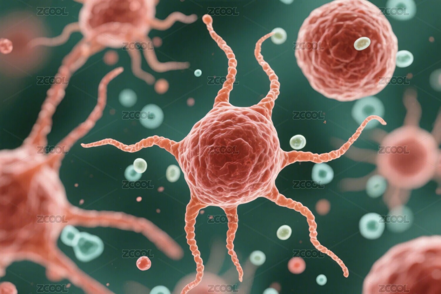 红色癌细胞蓝绿背景