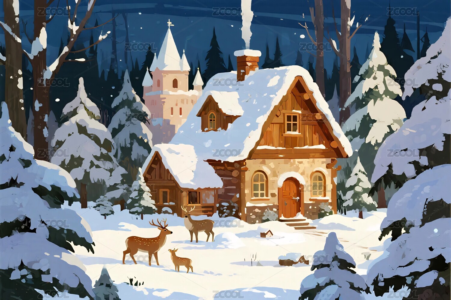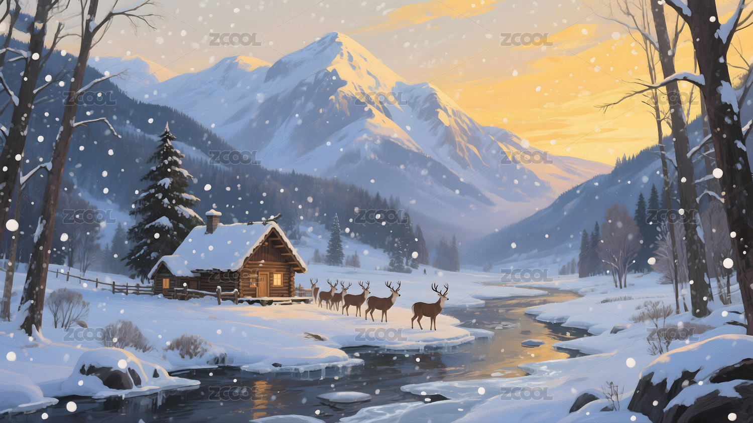 冬季仙境,冰雪,野生动物,自然风光,木屋,河流,森林,祥和,宁静,雪山