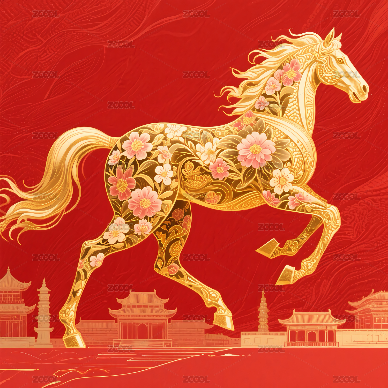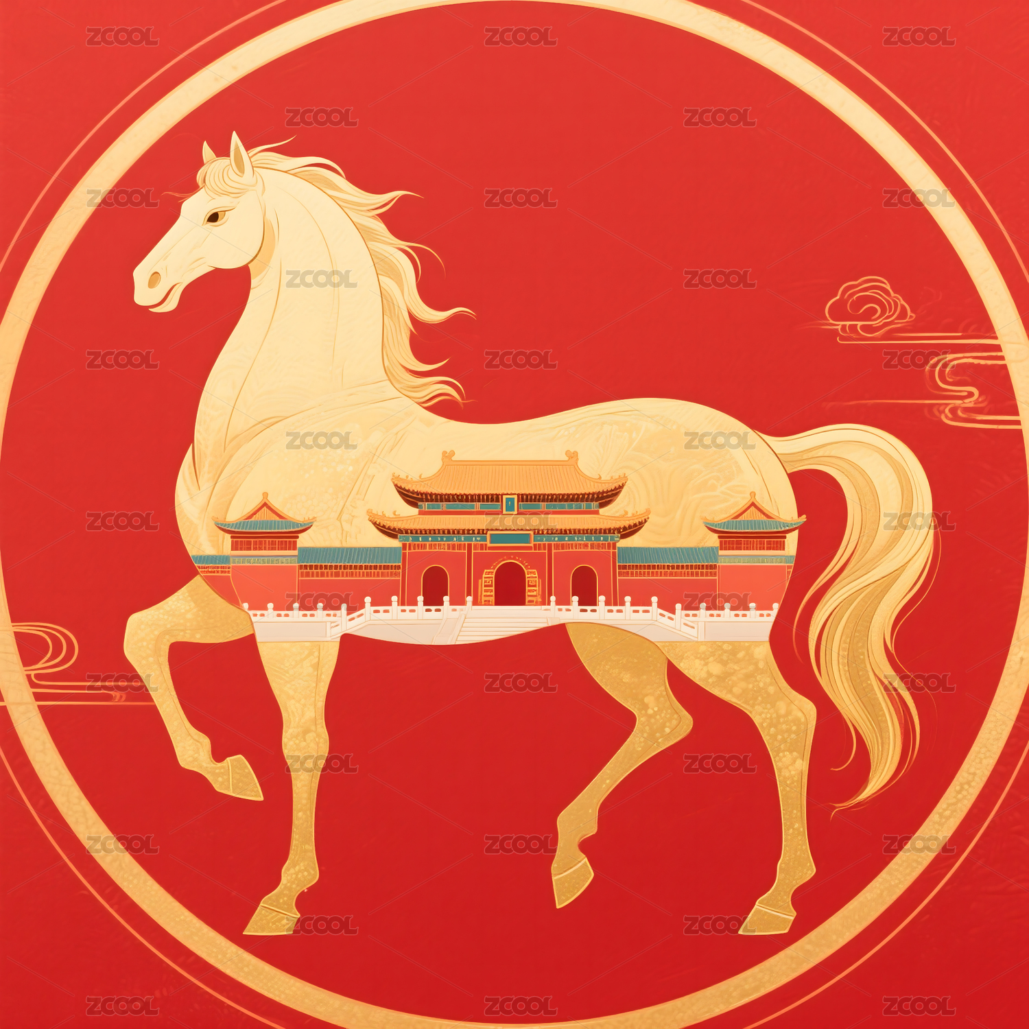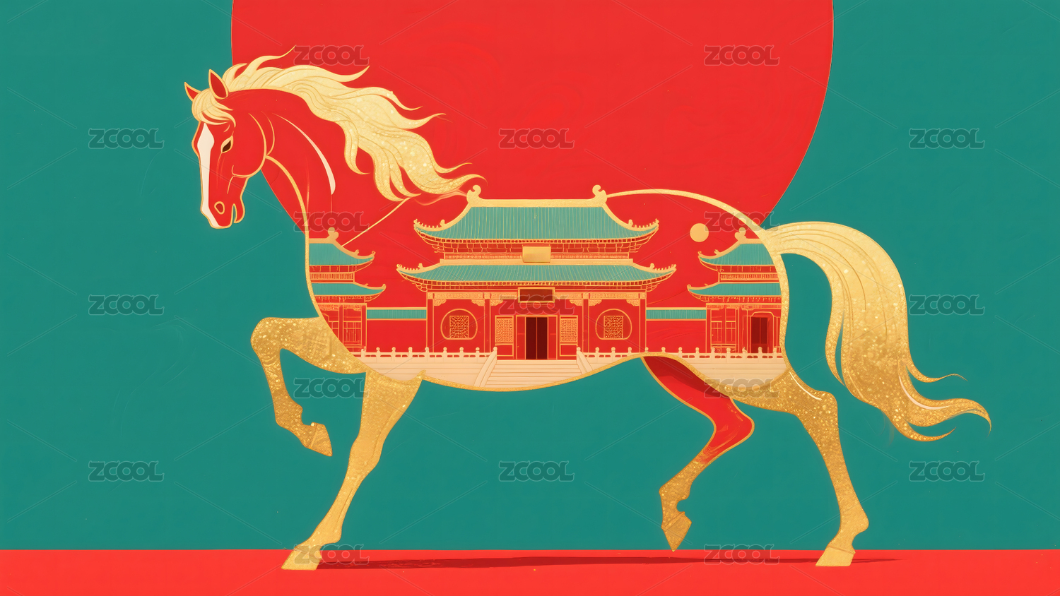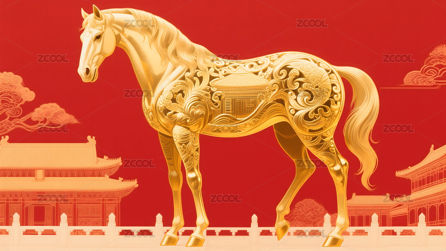 骏马,中国风,祥云,红色背景,金色,传统文化,建筑,插画,绘画,艺术