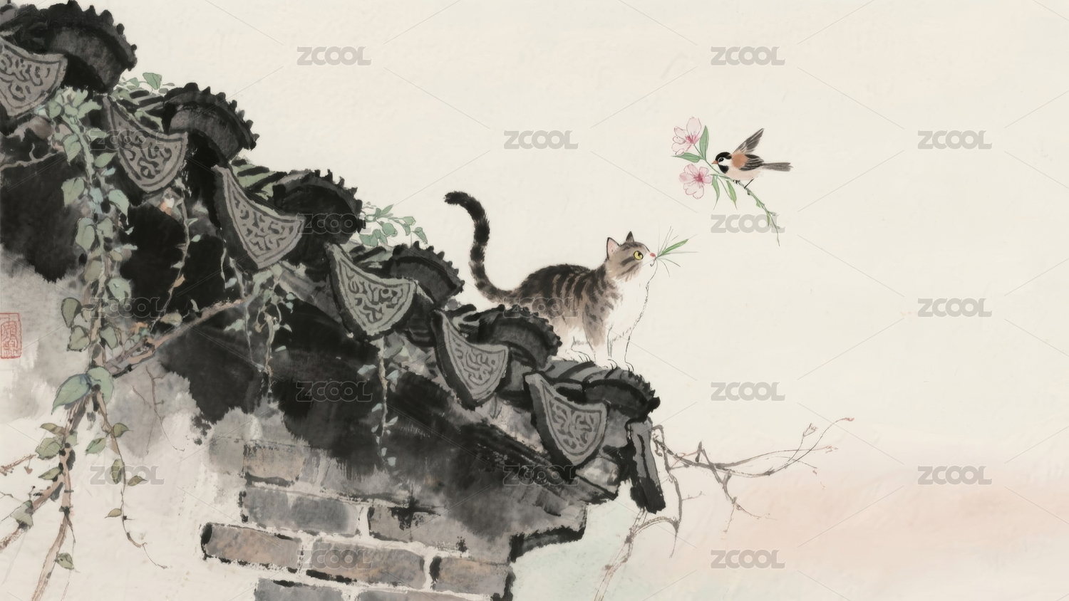 猫坐屋檐红花垂
