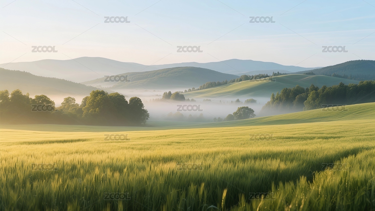 绿色田野远山雾气风景