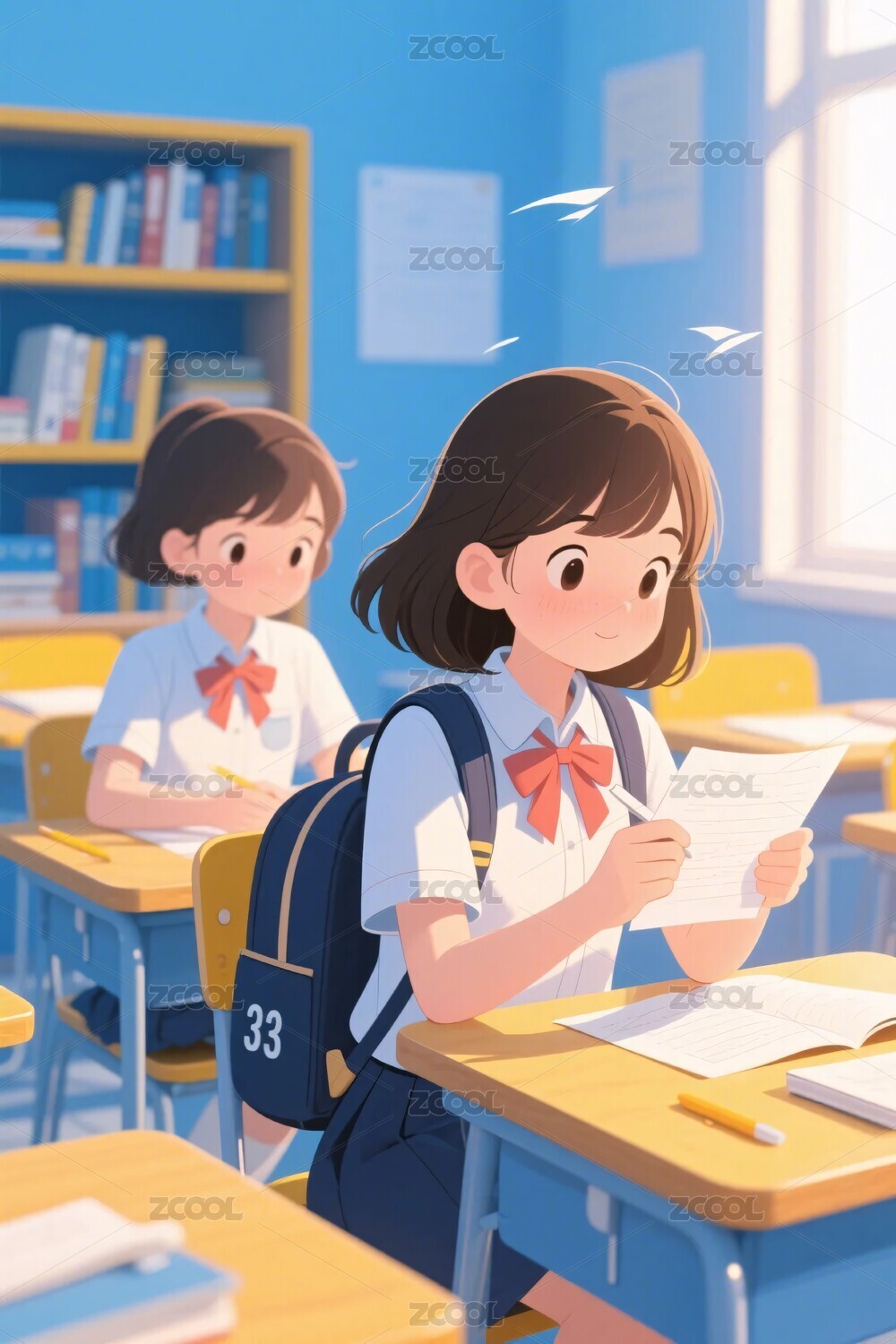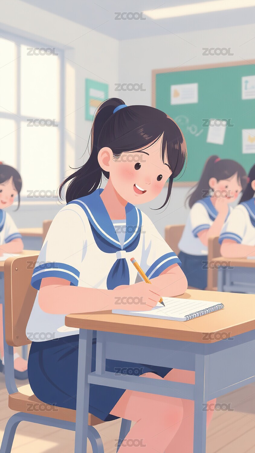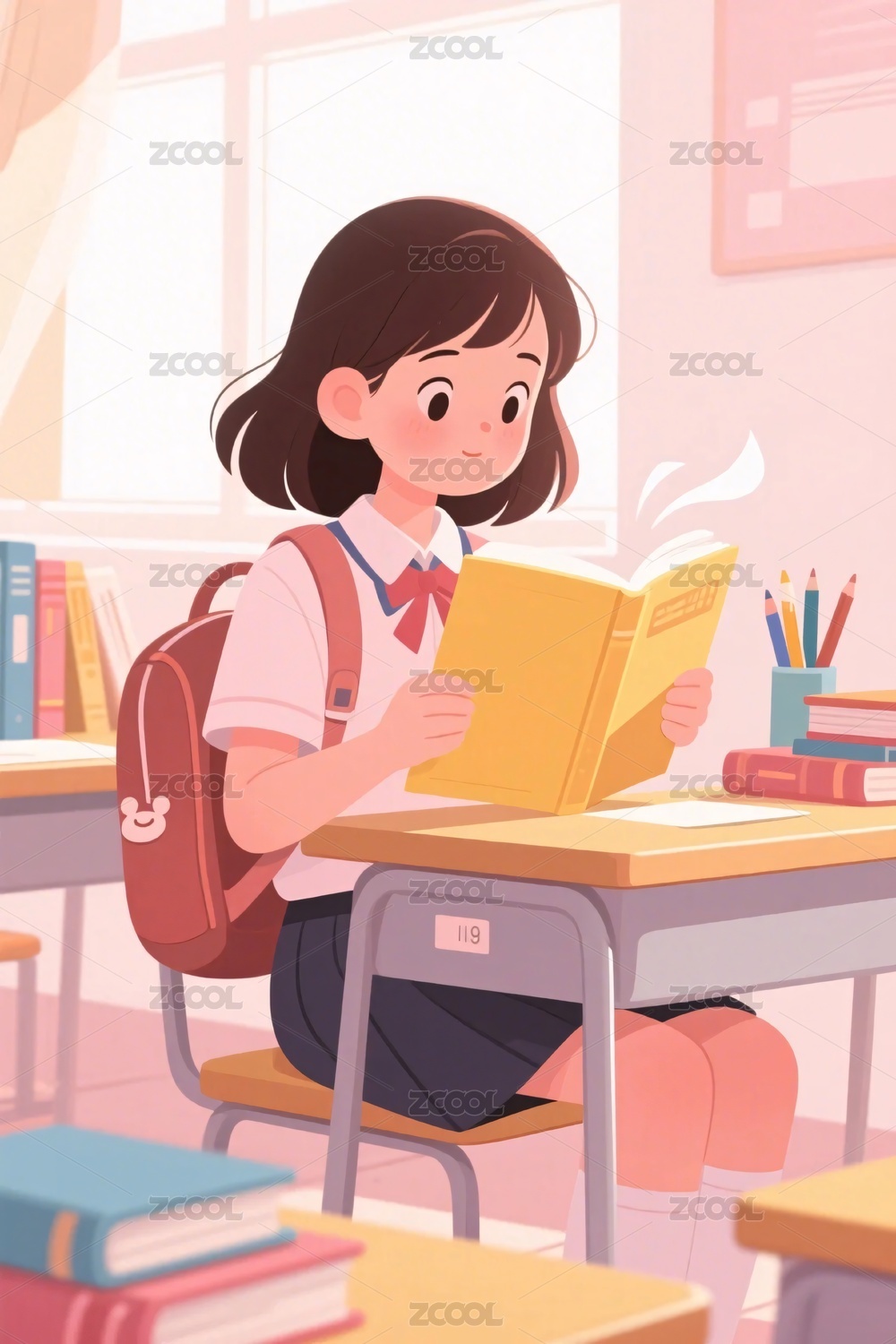 教室读书少女插画