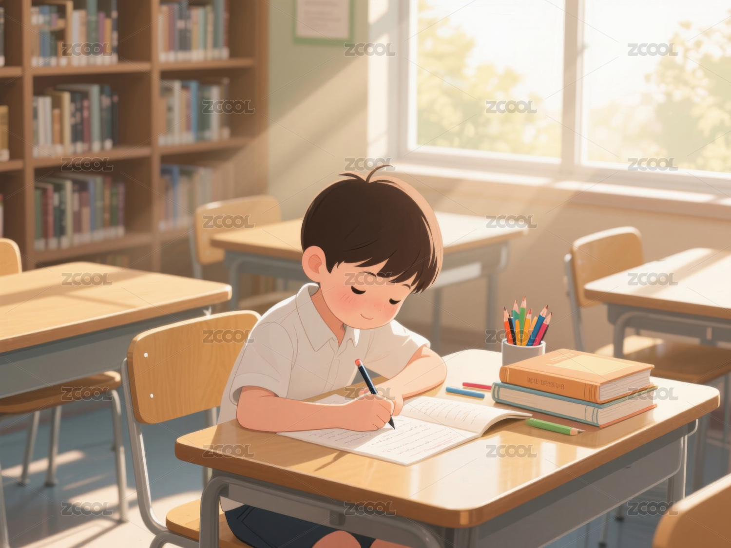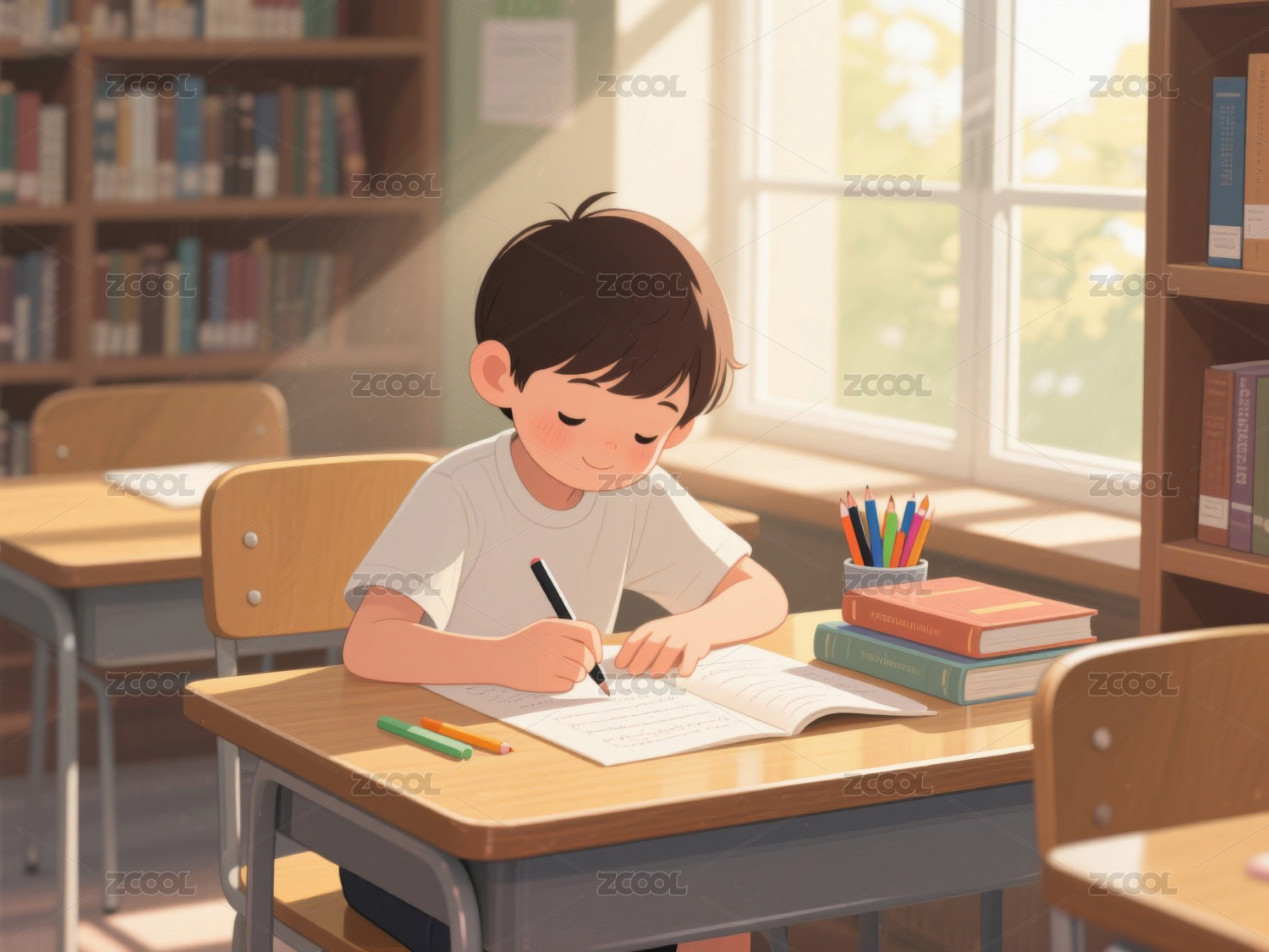 一个小男孩坐在窗边的书桌旁认真地看书
