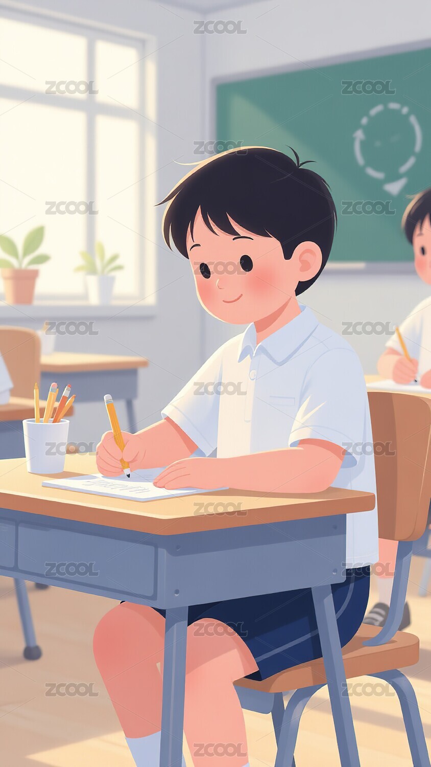 教室里专注学习的小男孩