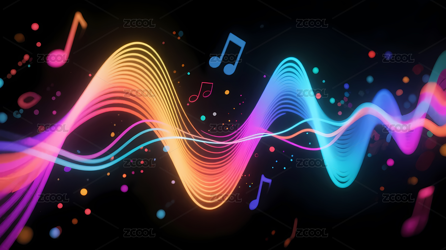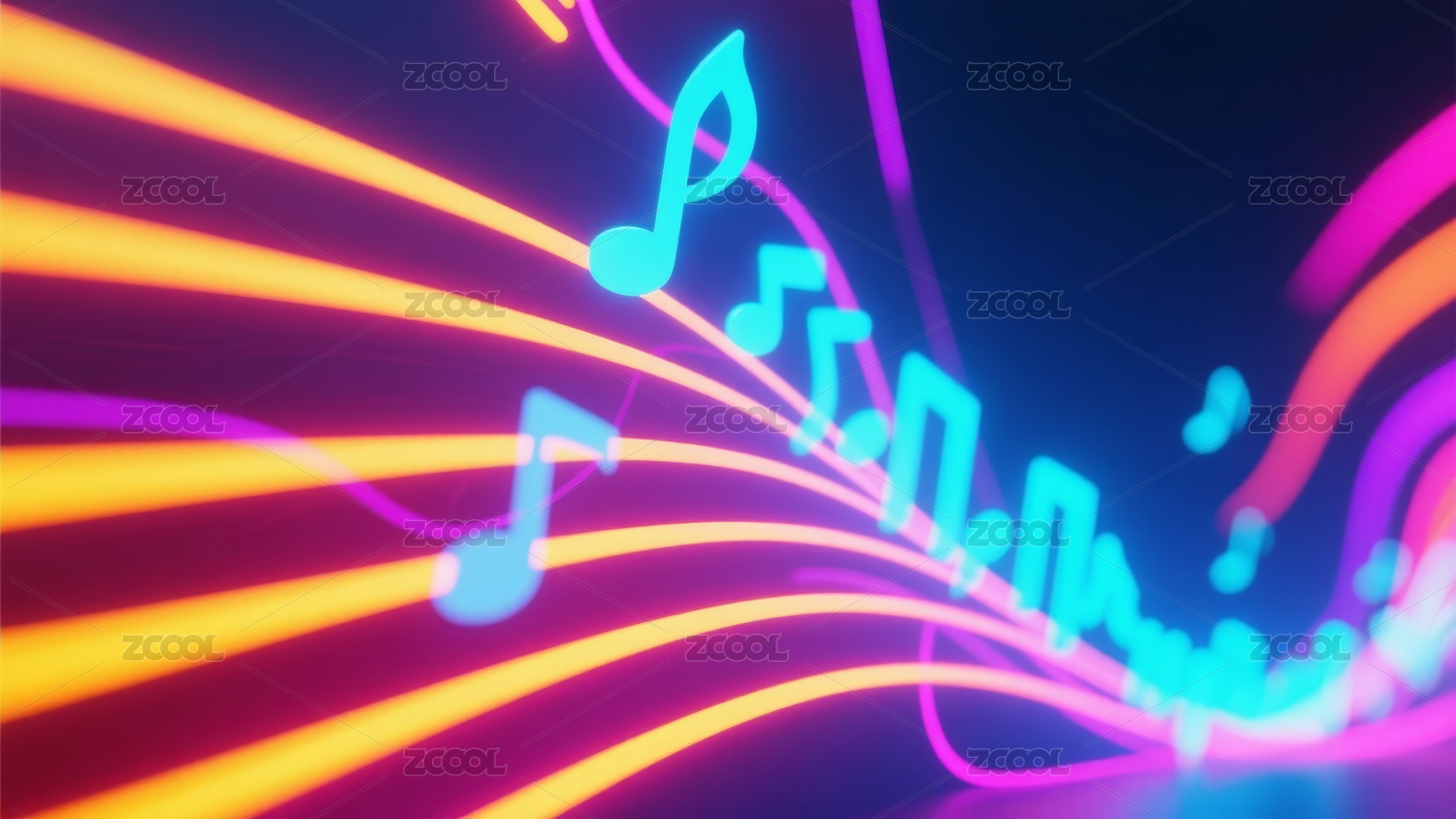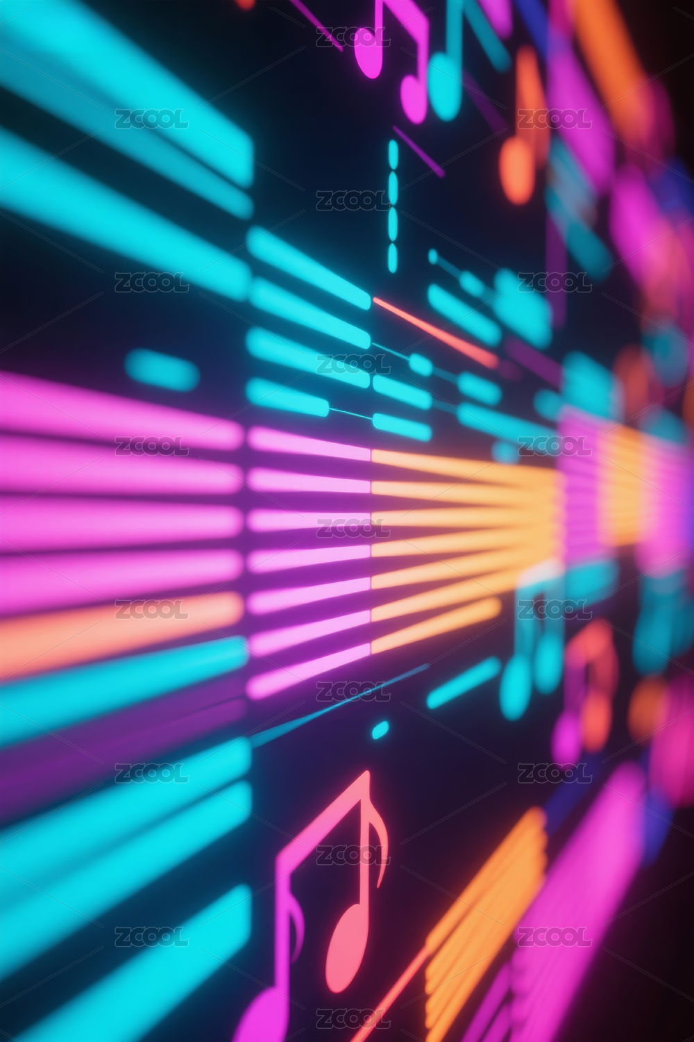 闪亮发光的音符与隧道舞台背景 三维渲染