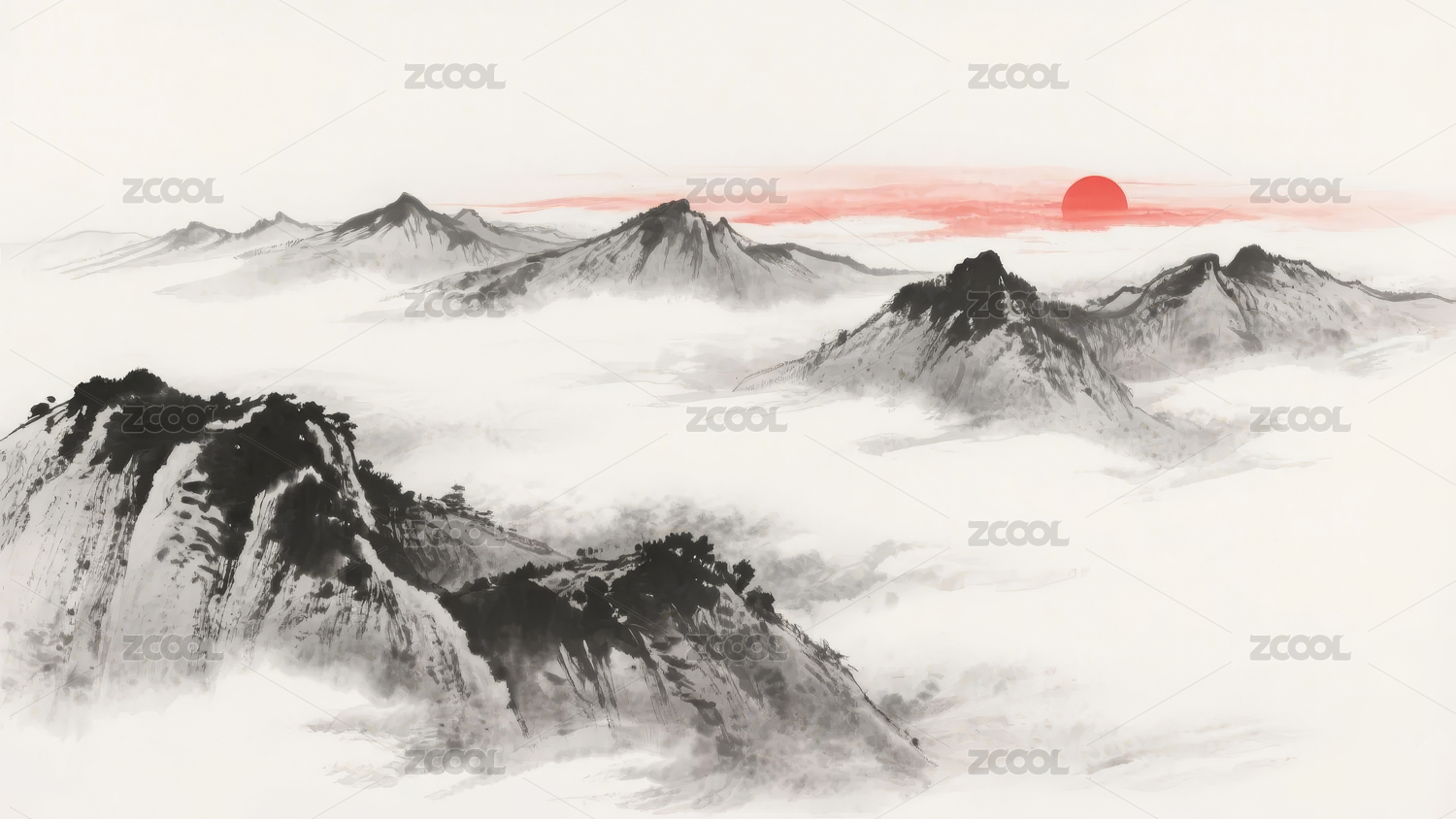 水墨山水红日风景