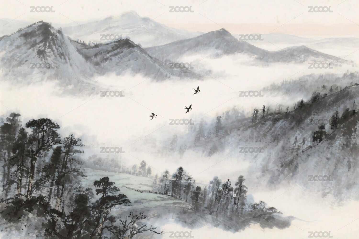 水墨山水飞鸟图